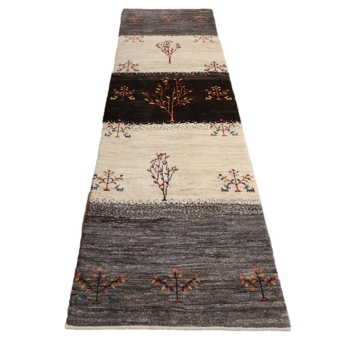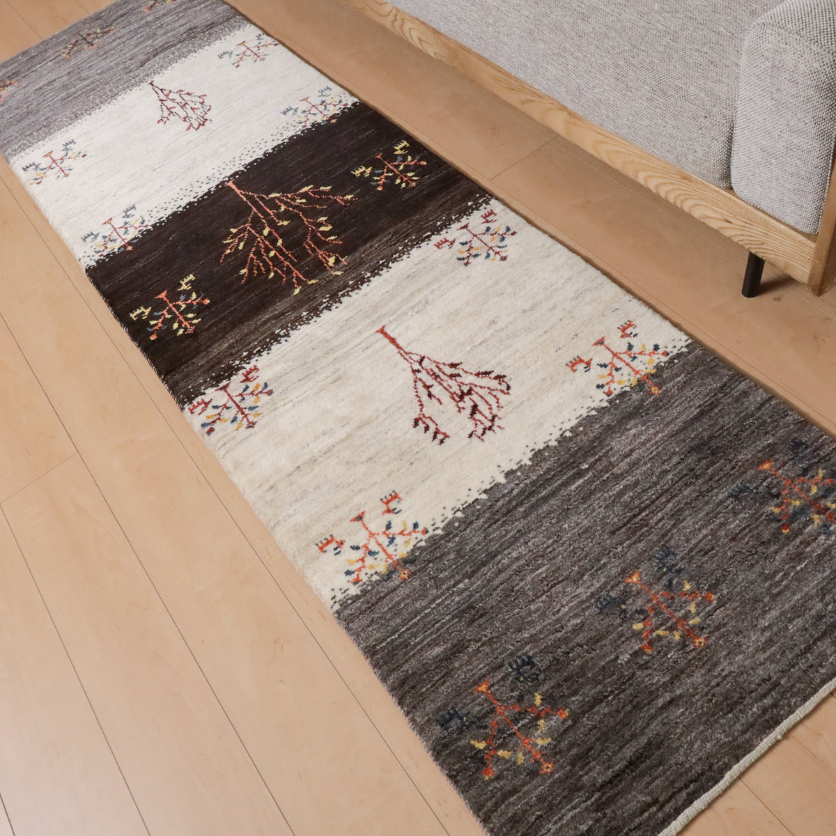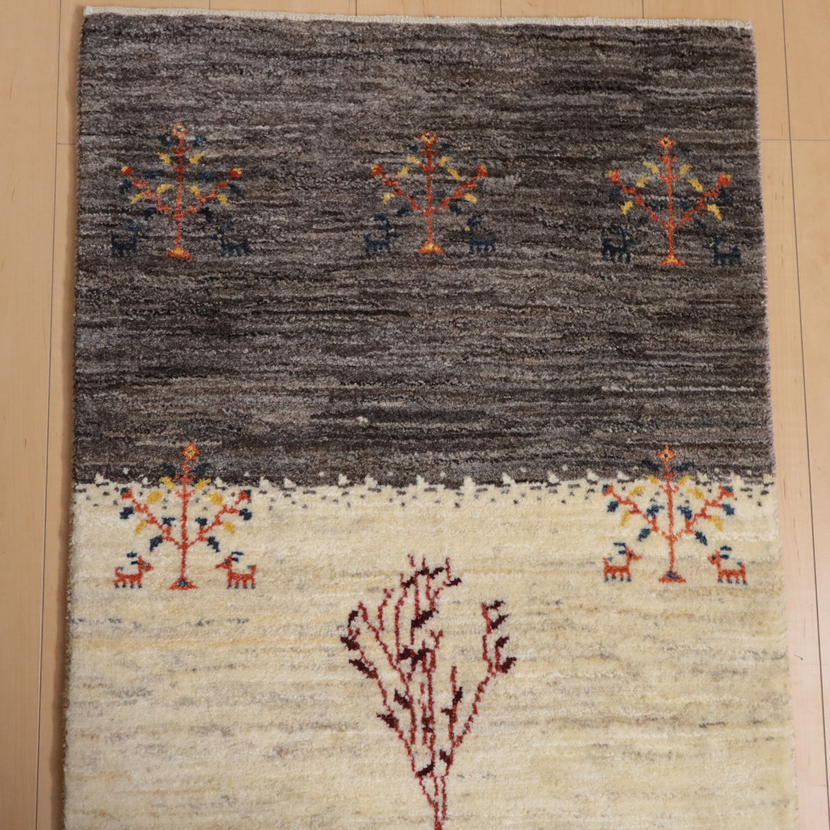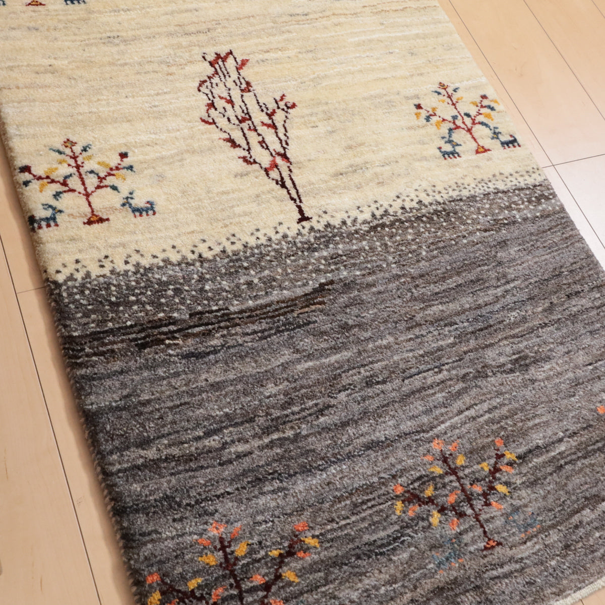 シンプルながらも美しいデザインが特徴の一枚です。茶グレー、生成りの背景に、繊細でカラフルな木や動物のモチーフが描かれています。お部屋に落ち着きと温かみを感じさせてくれるギャッベです。
