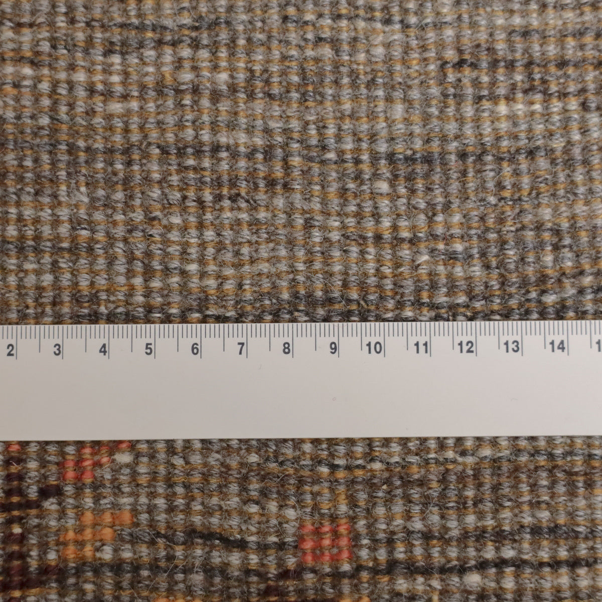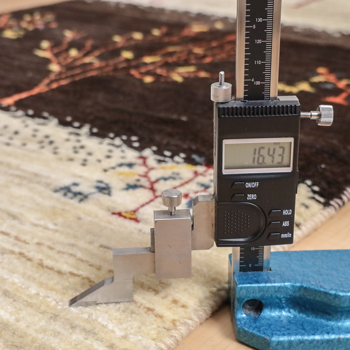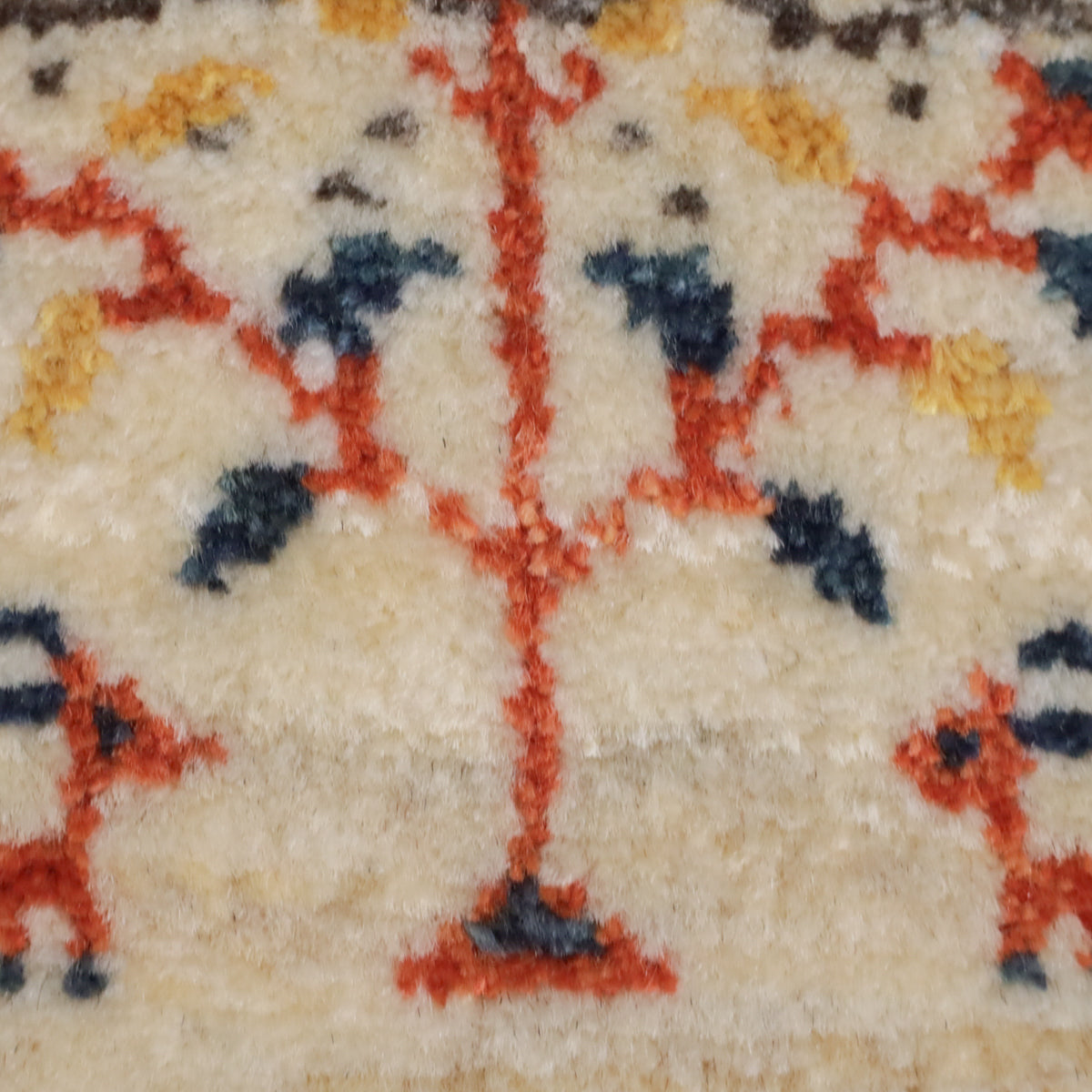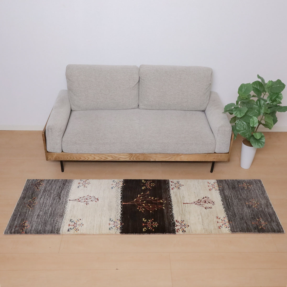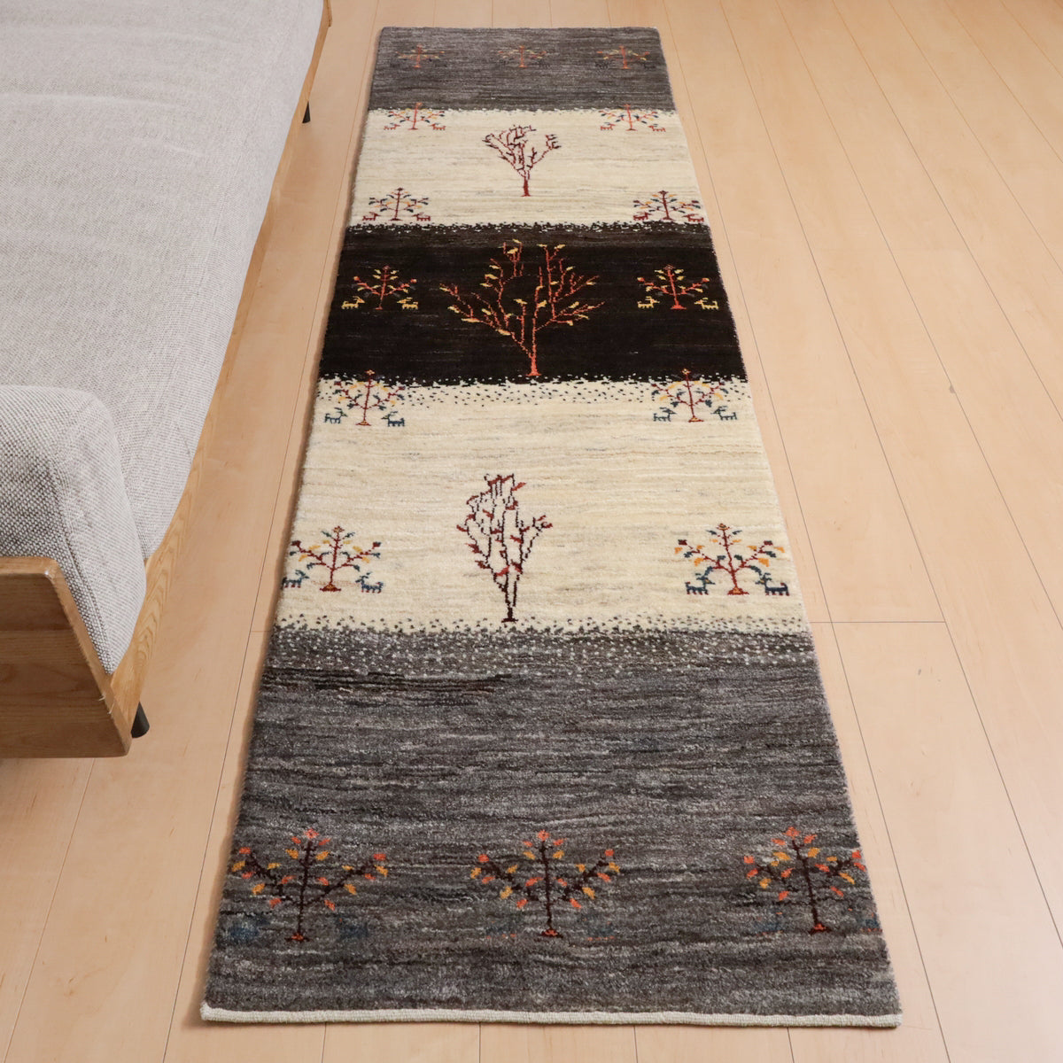 シンプルながらも美しいデザインが特徴の一枚です。茶グレー、生成りの背景に、繊細でカラフルな木や動物のモチーフが描かれています。お部屋に落ち着きと温かみを感じさせてくれるギャッベです。