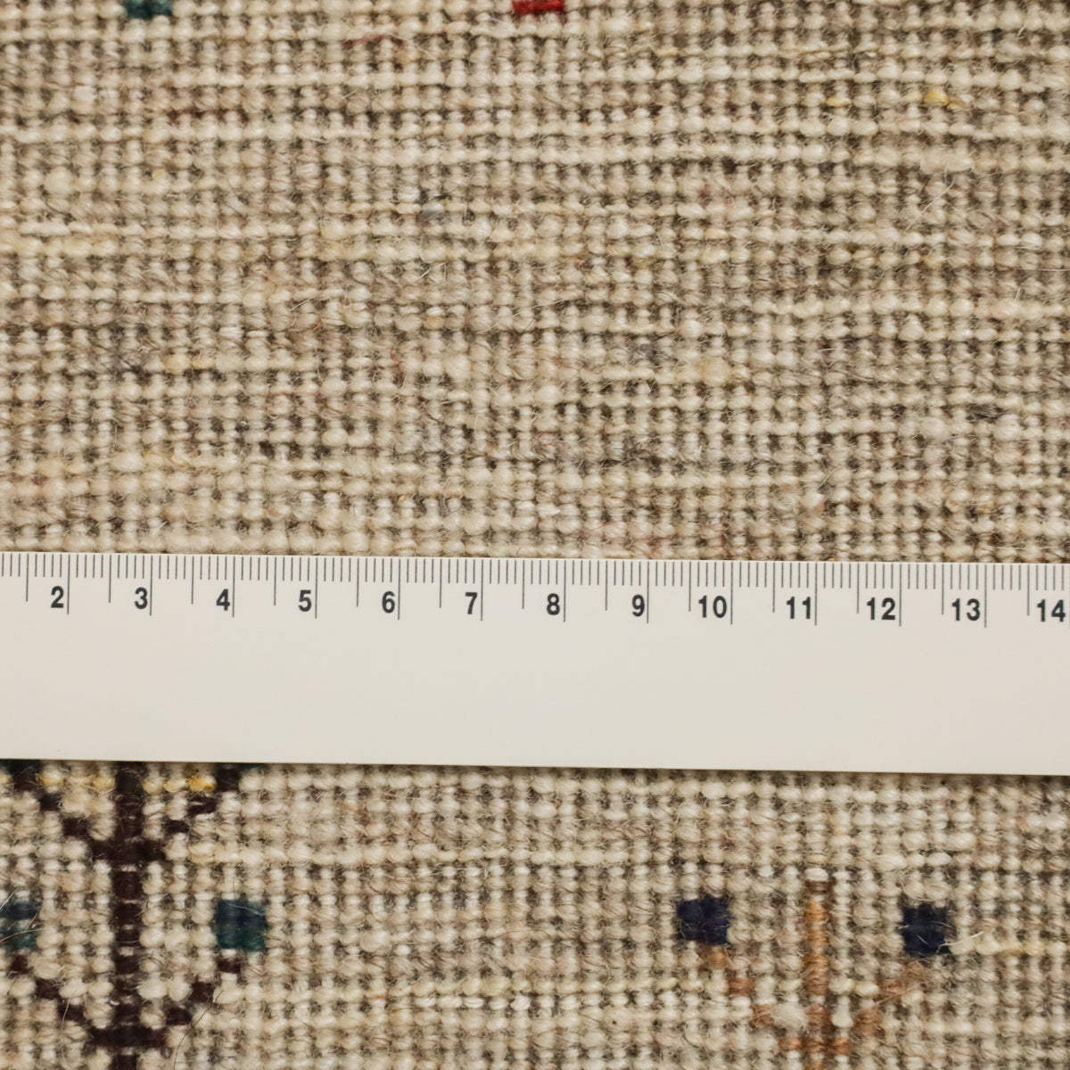 羊の毛色をそのまま活かした無染色の生成りは、どんな場所にも似合うナチュラルな風合い。グレーやベージュのグラデーションが広い風景のイメージ。木や花、動物がバランスよく入った敷く場所を選ばないデザインです。