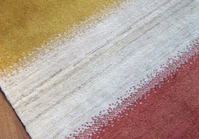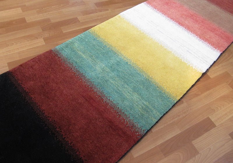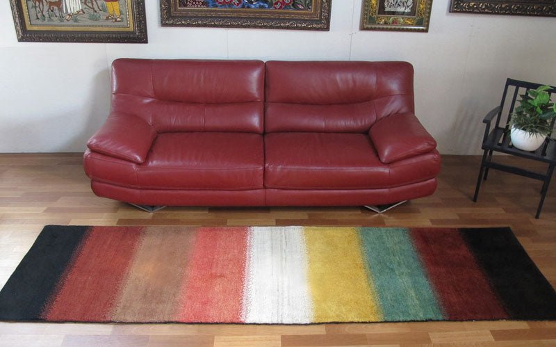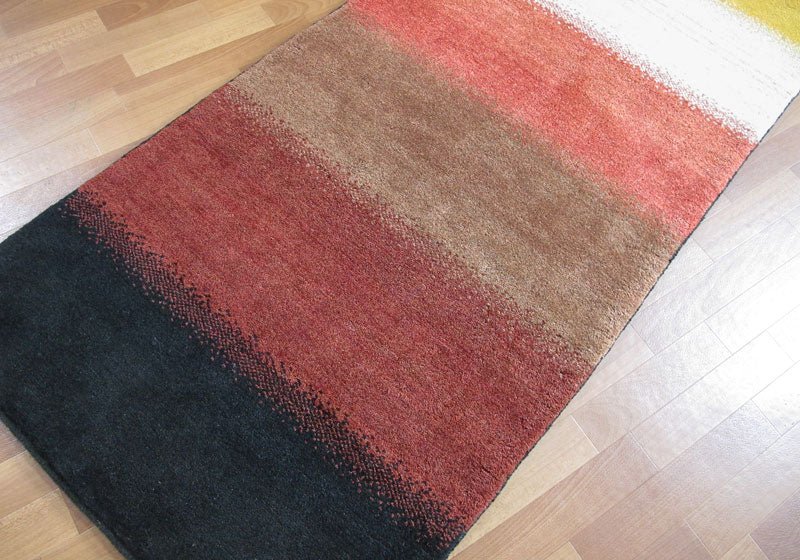 黒やエンジ、茶のシックな色と、桃、黄、緑、生成りの明るい色を繋げた彩豊かなモダン・ボーダー。落ち着きのある色合いはギャッベらしい素朴な風合いを持ちインテリアにもうまく溶け込んでくれます。厚みは18ミリ強位、踏んだ時ふんわり柔らかな踏み心地、ハリのある細やかな毛足で、遊び毛も少なく、ふわり滑らかな良い手触りです。