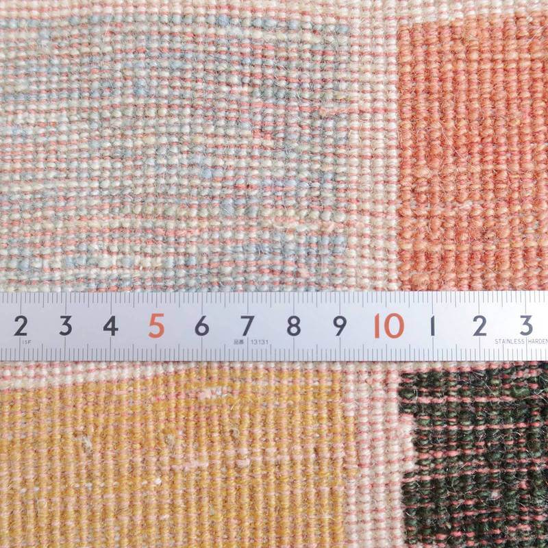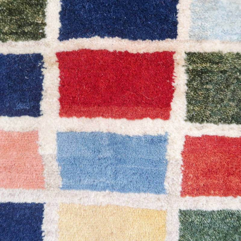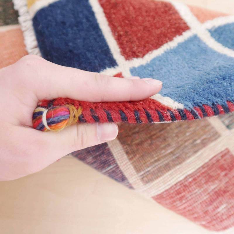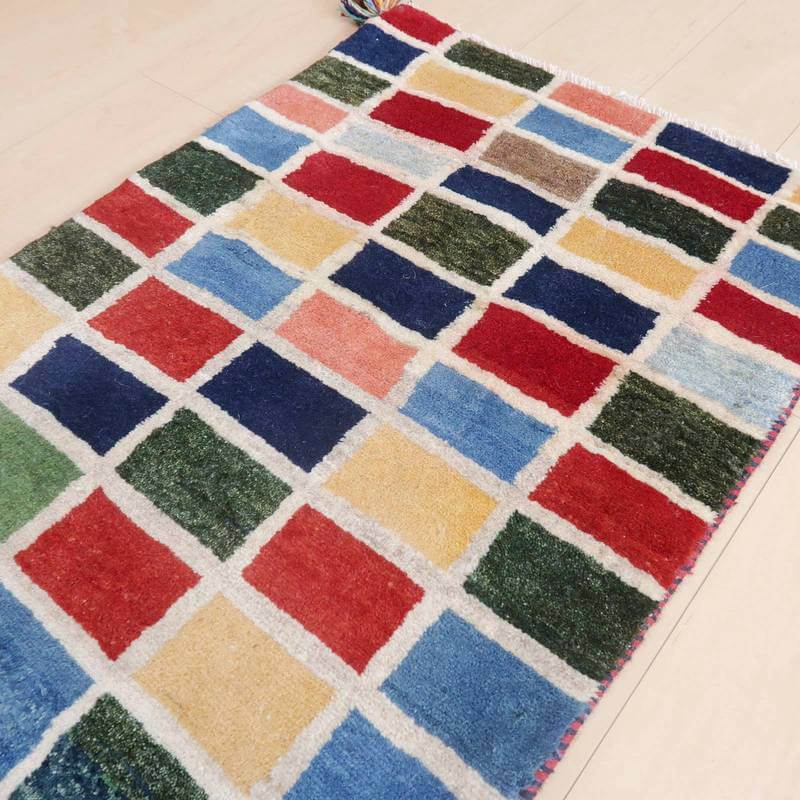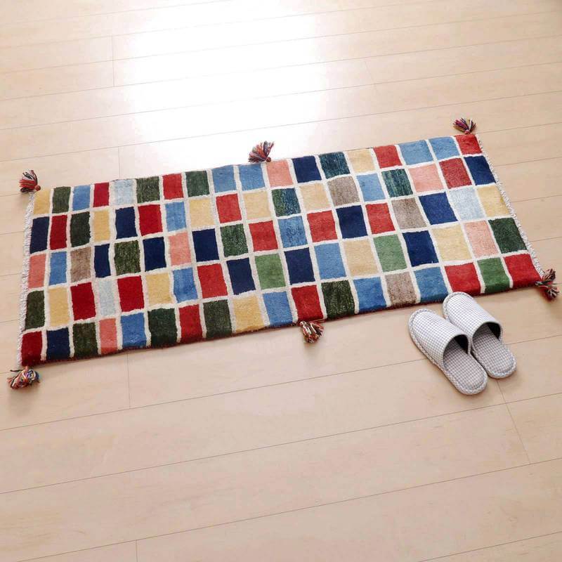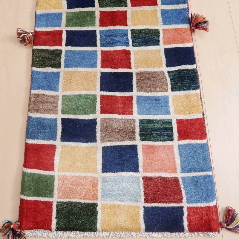 落ち着きのあるカラフルな色彩がバランスよく配置された、雰囲気の良いタイル柄のデザイン。お部屋のほど良いアクセントになるギャッベです。