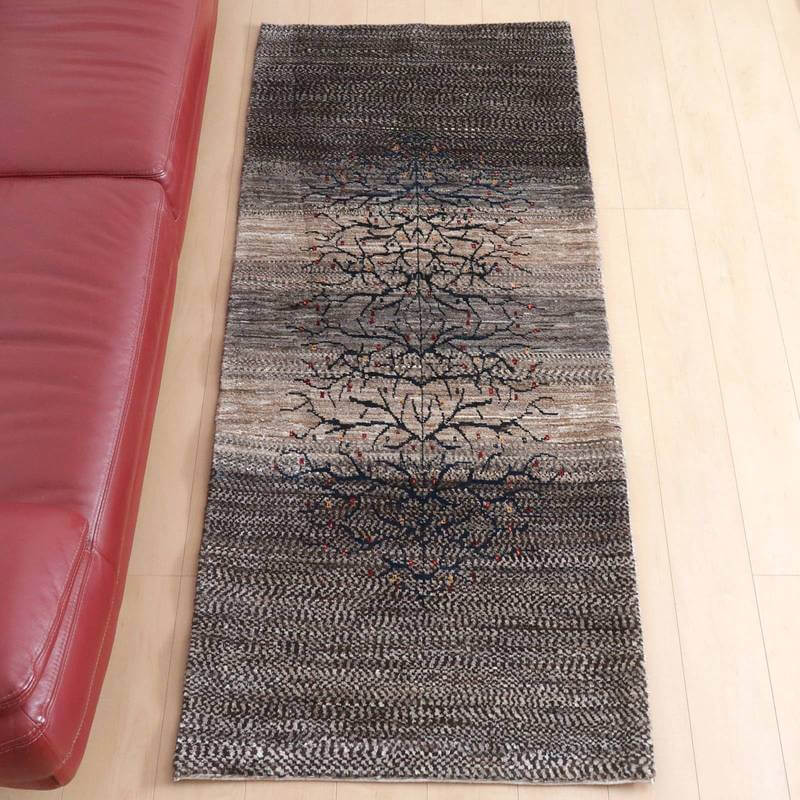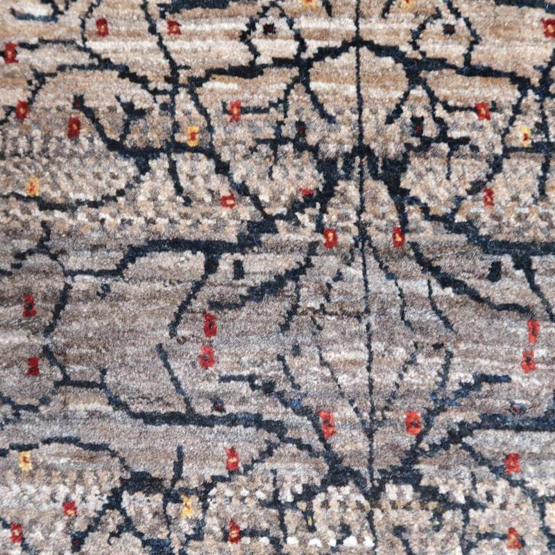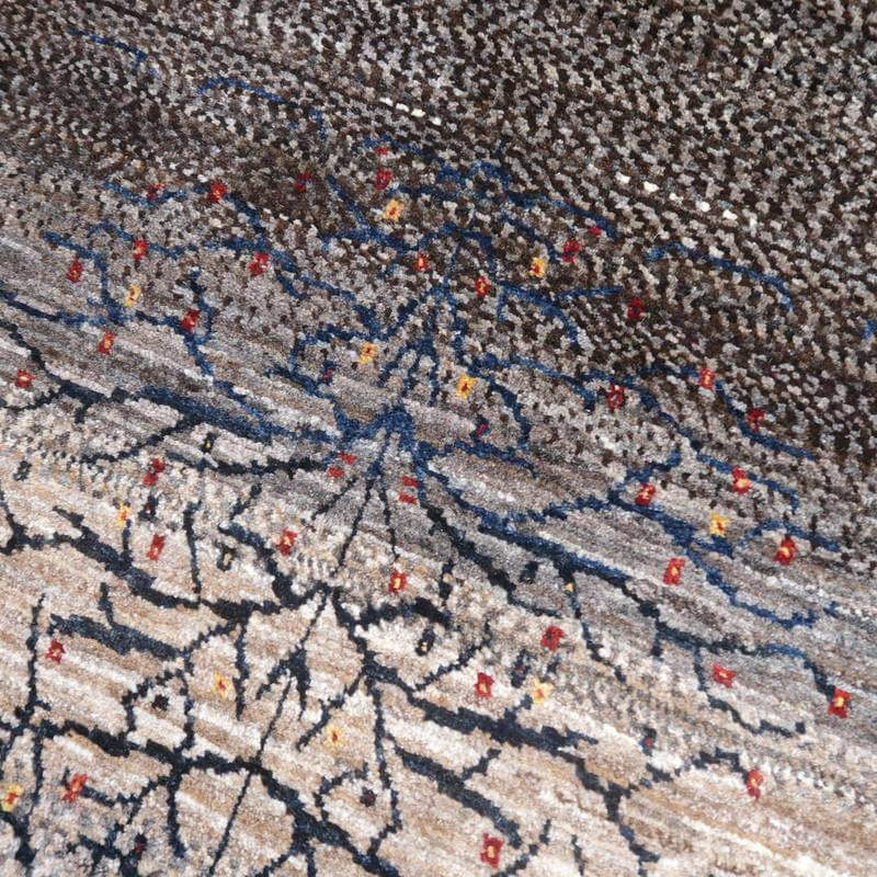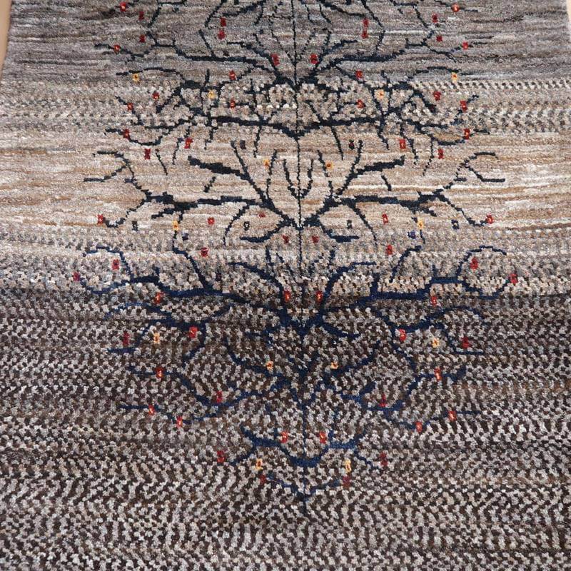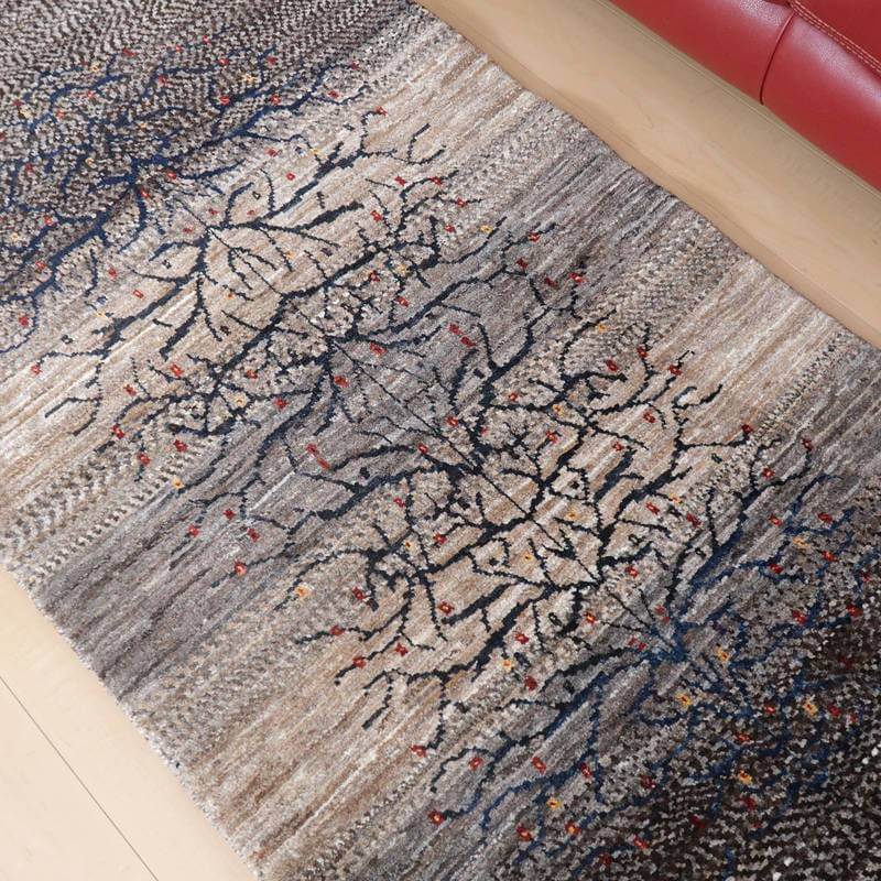 茶、グレー、ベージュなど濃い羊の毛色を組み合わせてまだら模様やグラデーションに織っていったシックなトーンのナチュラルカラーのギャッベ。濃紺の生命の木がすくっと伸びた幻想的な雰囲気です。