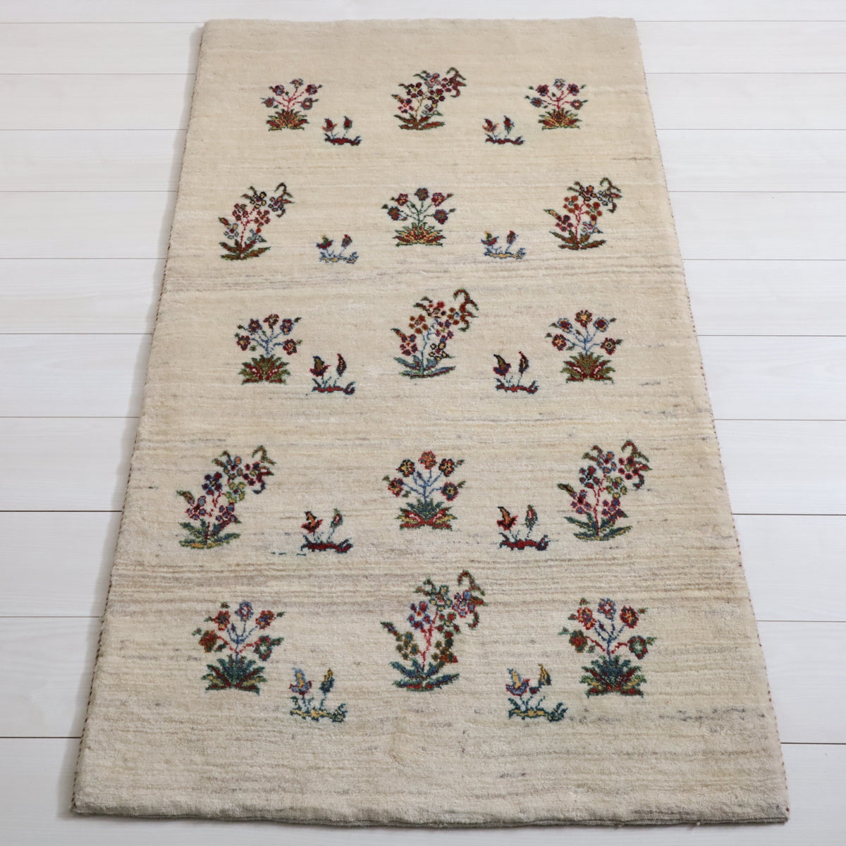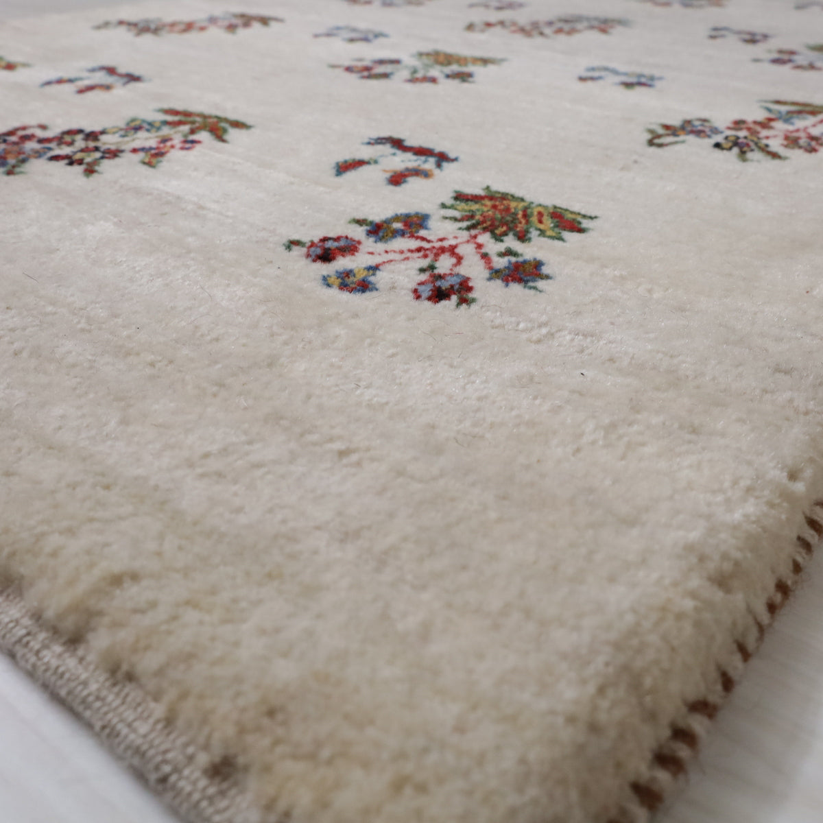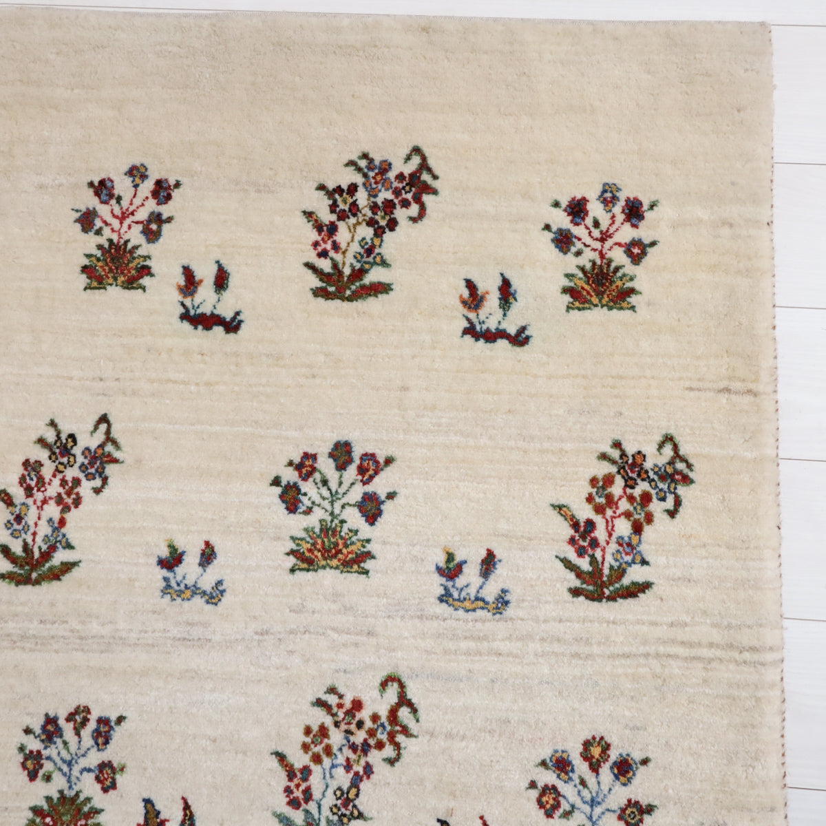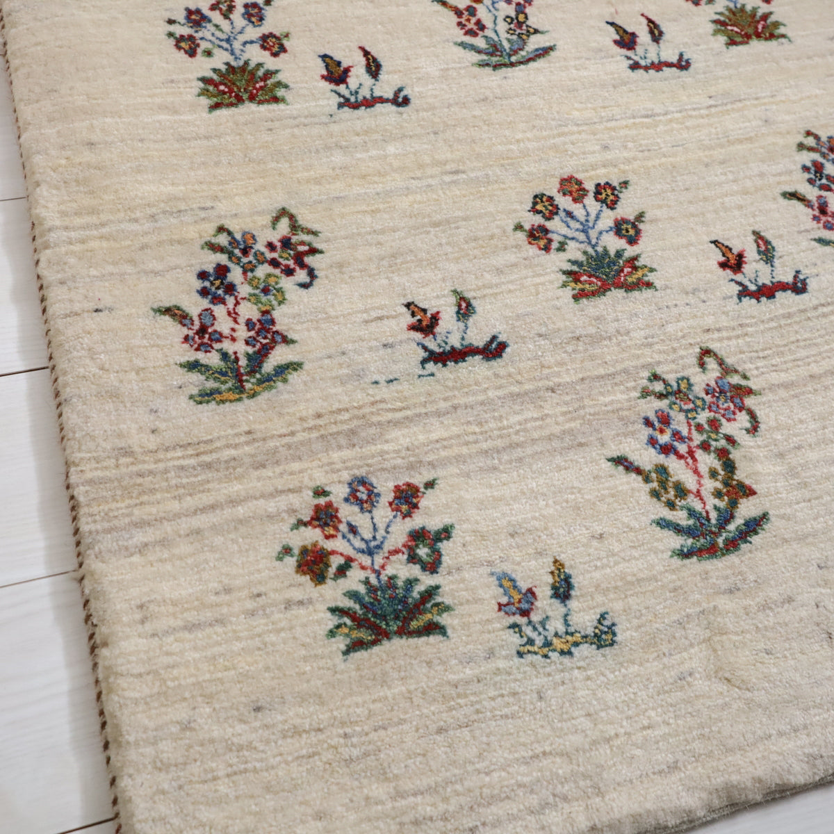羊の毛色を生かした生成りを基調にしたギャッベです。落ち着いた色味で草花のモチーフが描かれ、温かみと華やかさを感じさせます。自然の美しさと繊細なデザインが調和し、心地よい空間を演出してくれる一枚です。