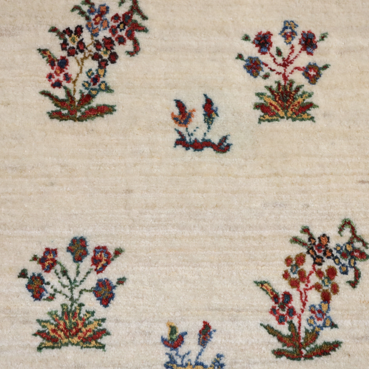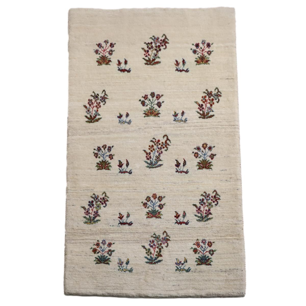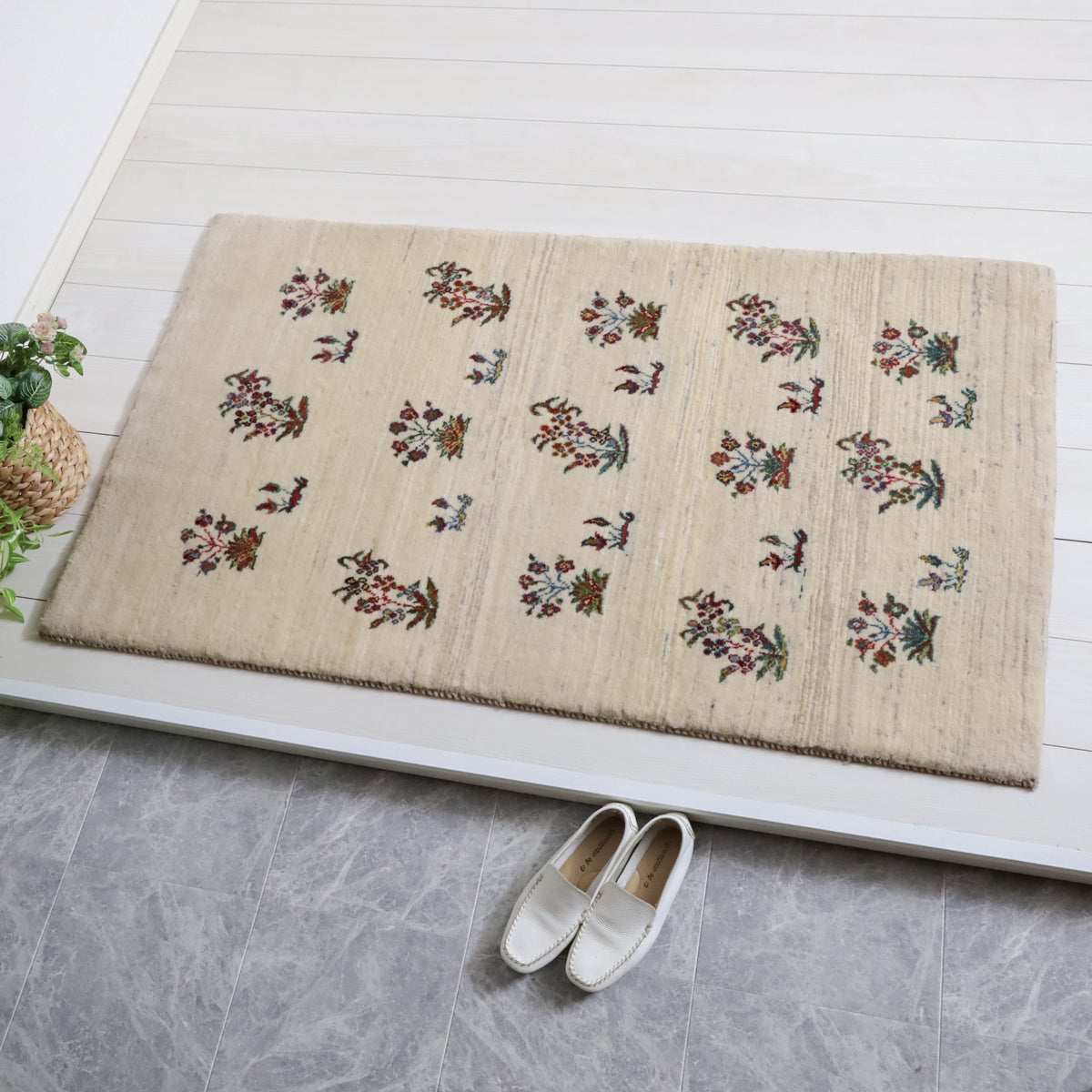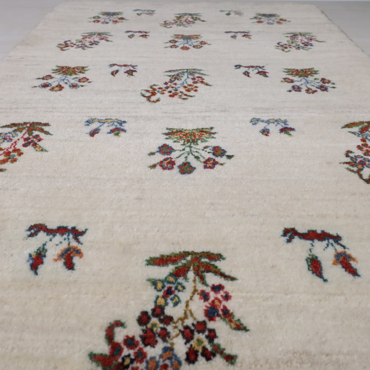 羊の毛色を生かした生成りを基調にしたギャッベです。落ち着いた色味で草花のモチーフが描かれ、温かみと華やかさを感じさせます。自然の美しさと繊細なデザインが調和し、心地よい空間を演出してくれる一枚です。