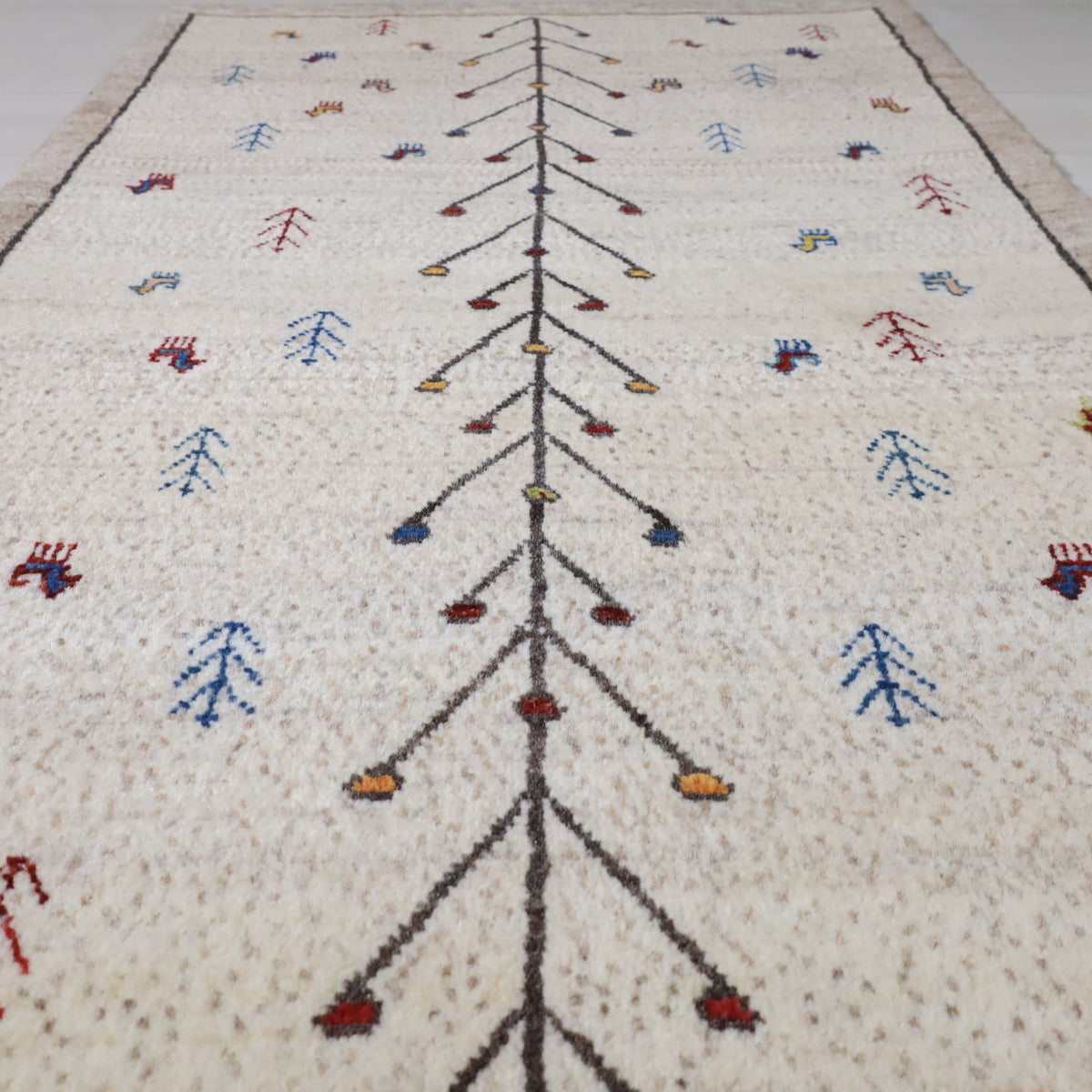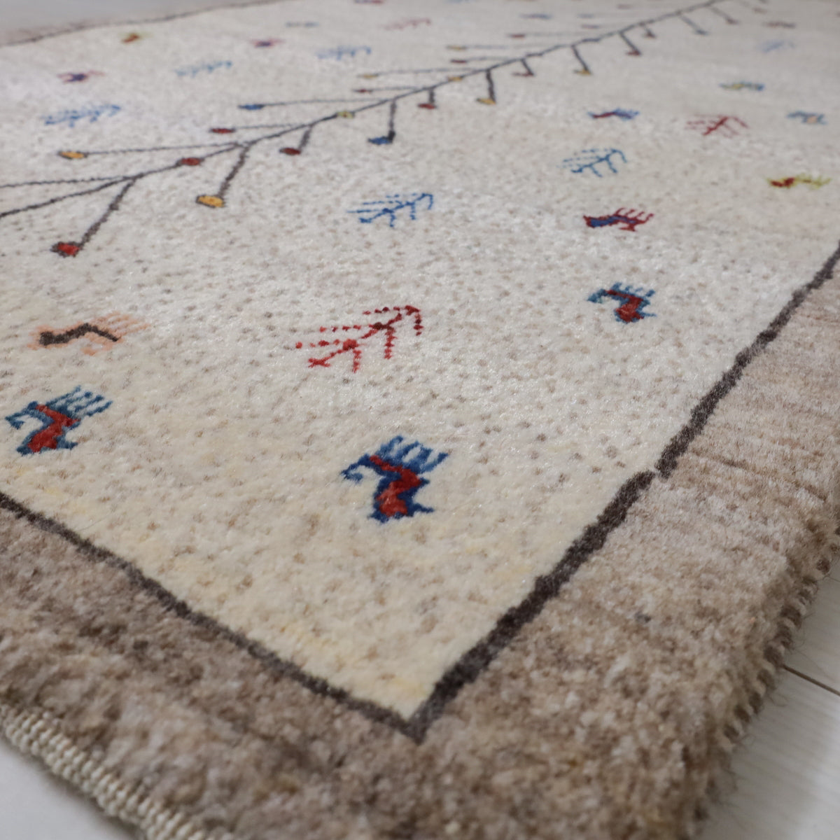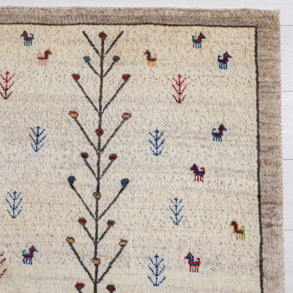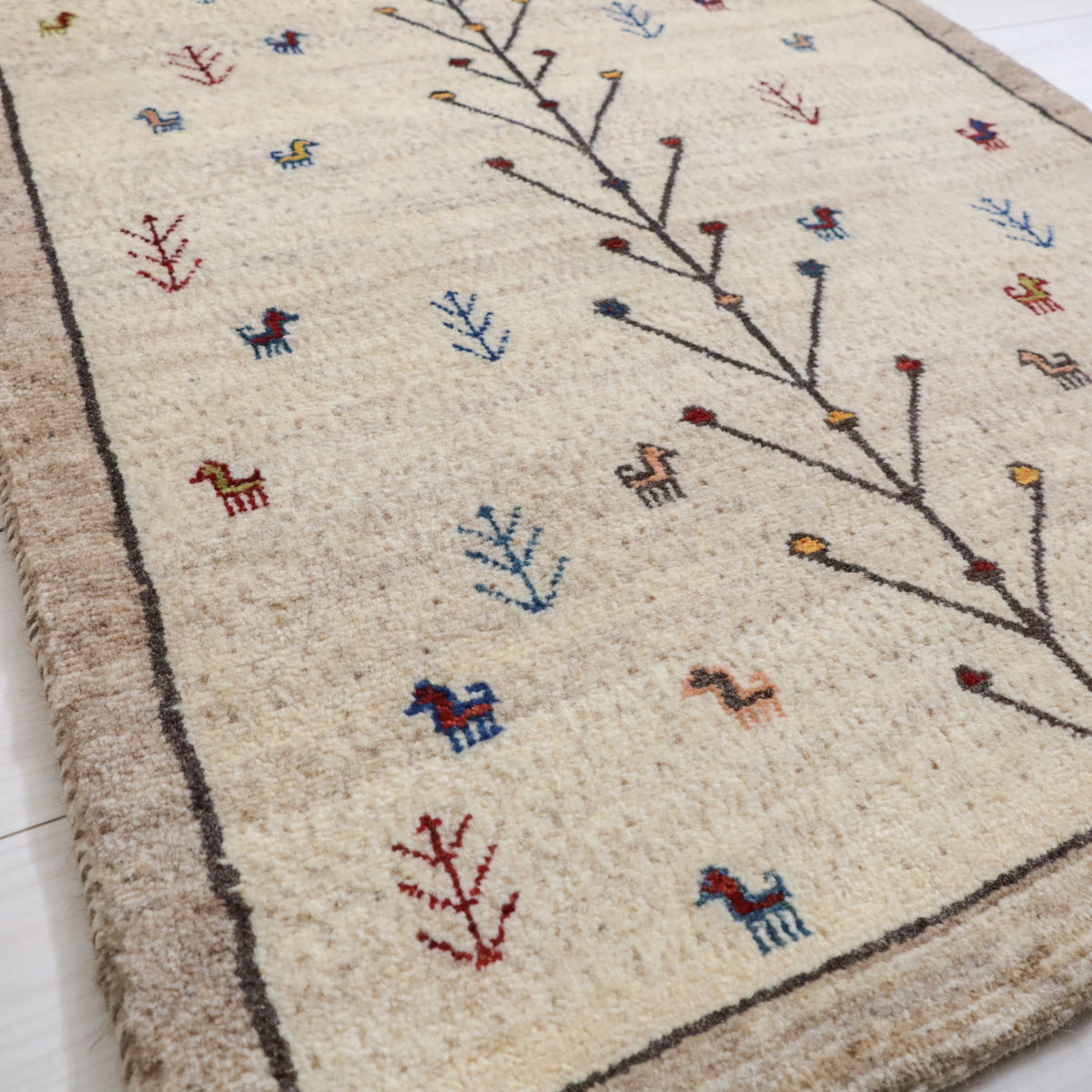 羊の毛色を生かした生成りを基調にしたギャッベです。中央には生命の木のモチーフが描かれ、周囲にはカラフルな動物や植物のモチーフが散りばめられています。赤や青、黄色の色使いが鮮やかで、印象的なデザインがお部屋に明るく楽しい雰囲気を感じさせます。シンプルながらも細やかなディテールが魅力の一枚です。