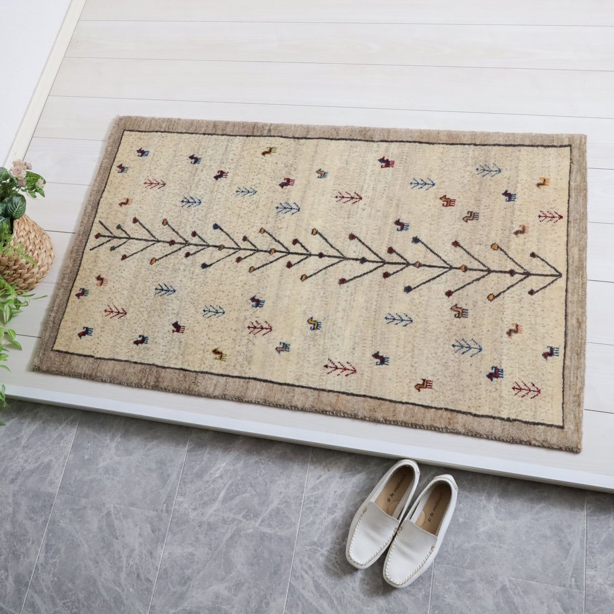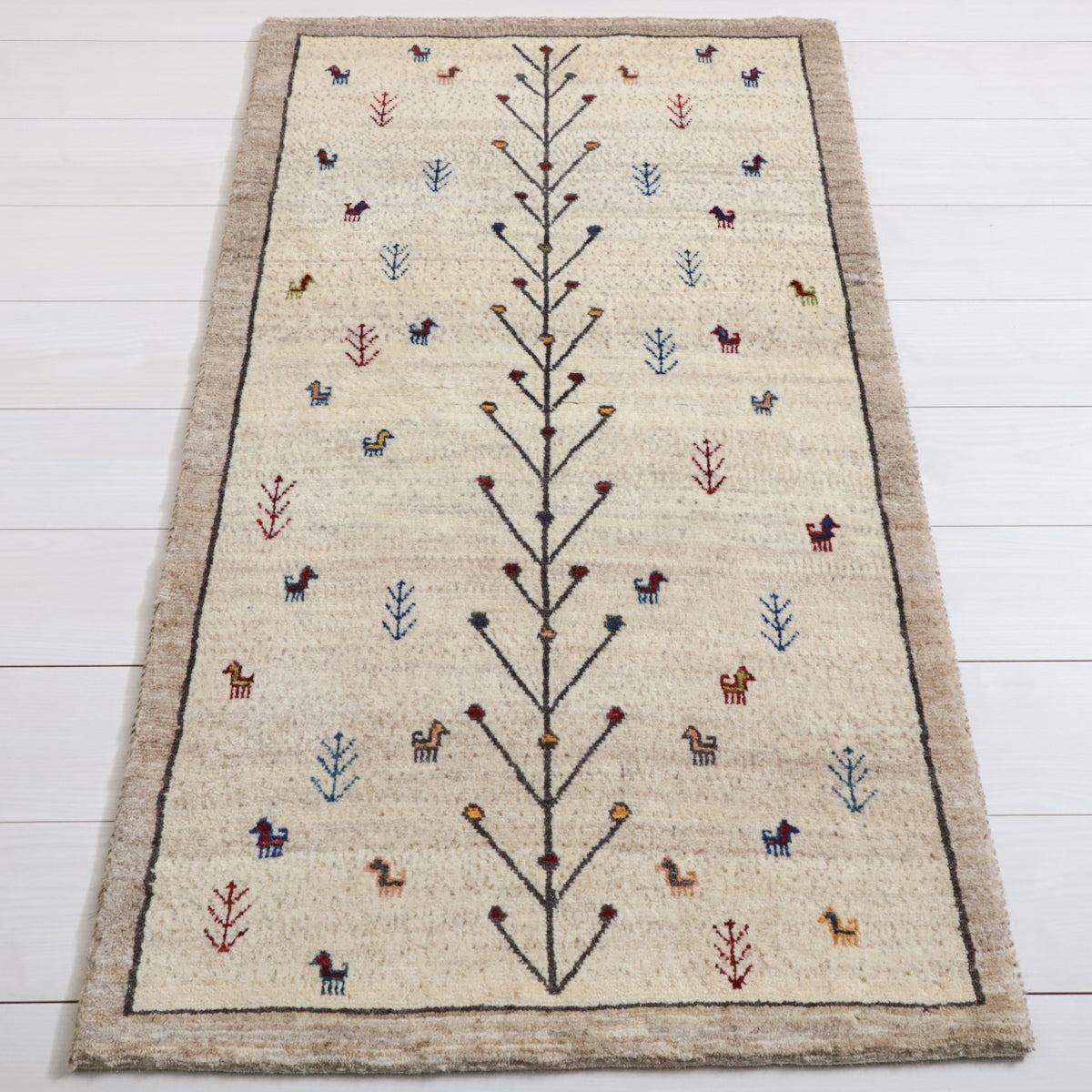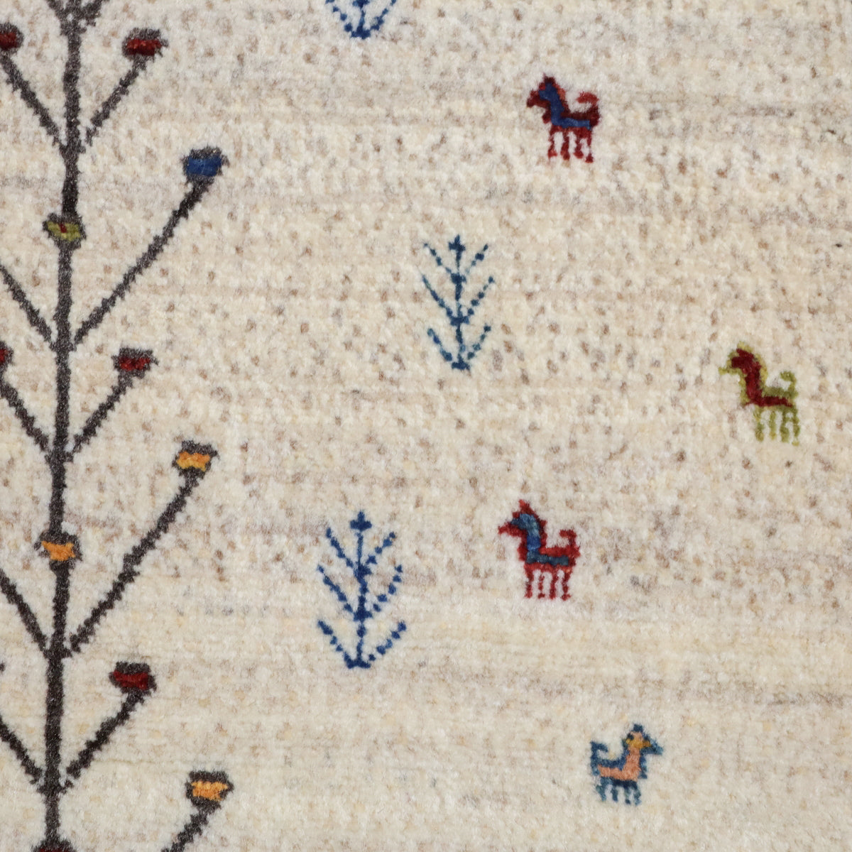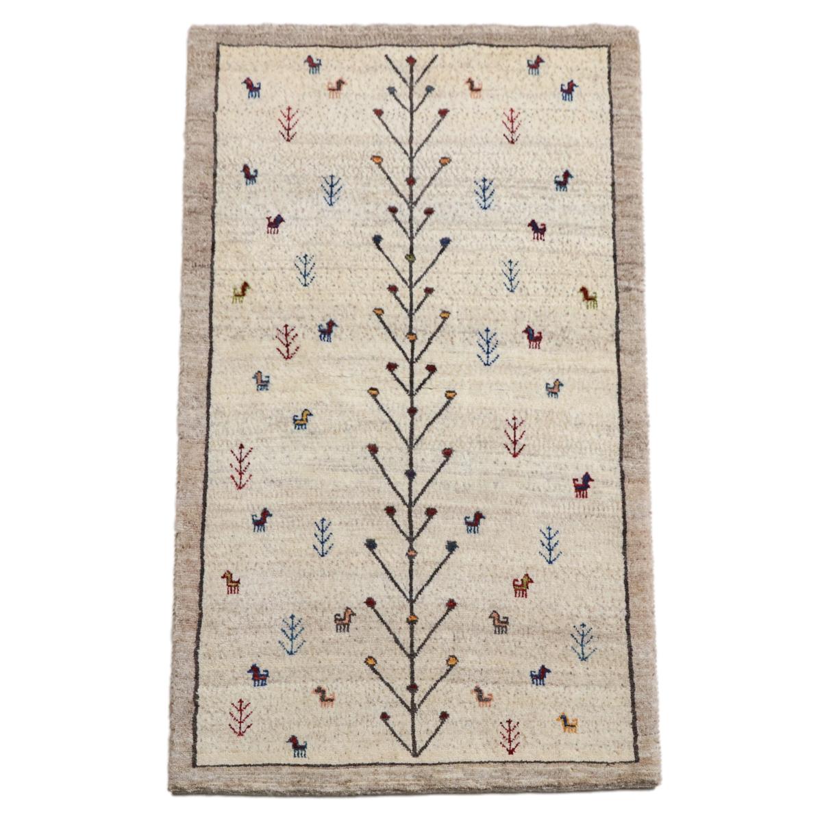 羊の毛色を生かした生成りを基調にしたギャッベです。中央には生命の木のモチーフが描かれ、周囲にはカラフルな動物や植物のモチーフが散りばめられています。赤や青、黄色の色使いが鮮やかで、印象的なデザインがお部屋に明るく楽しい雰囲気を感じさせます。シンプルながらも細やかなディテールが魅力の一枚です。