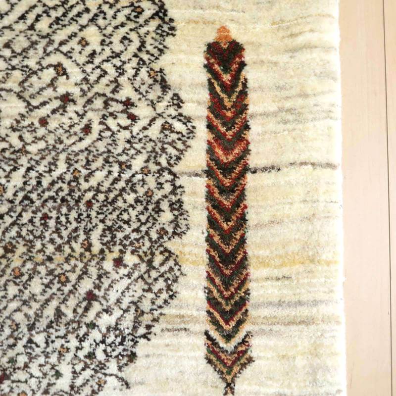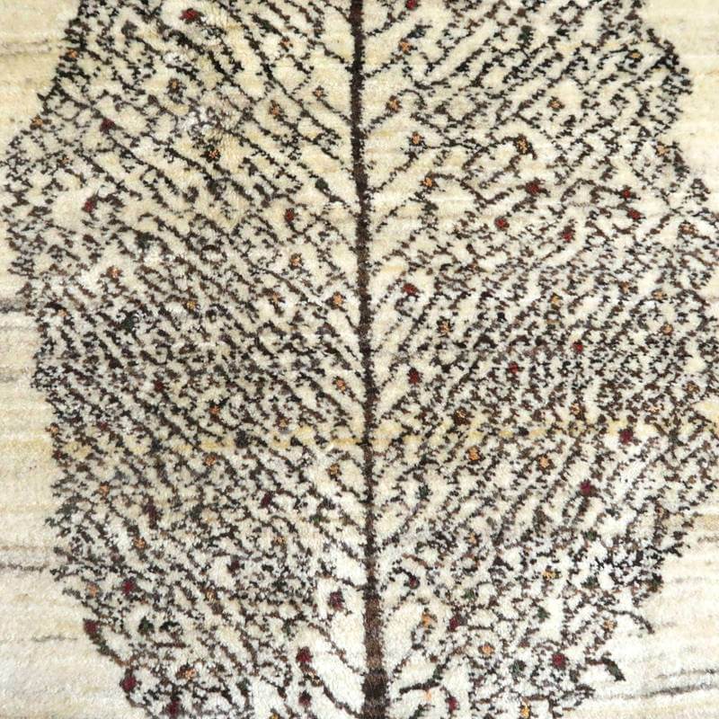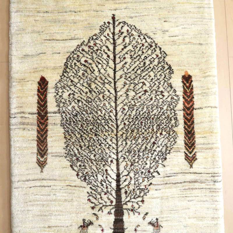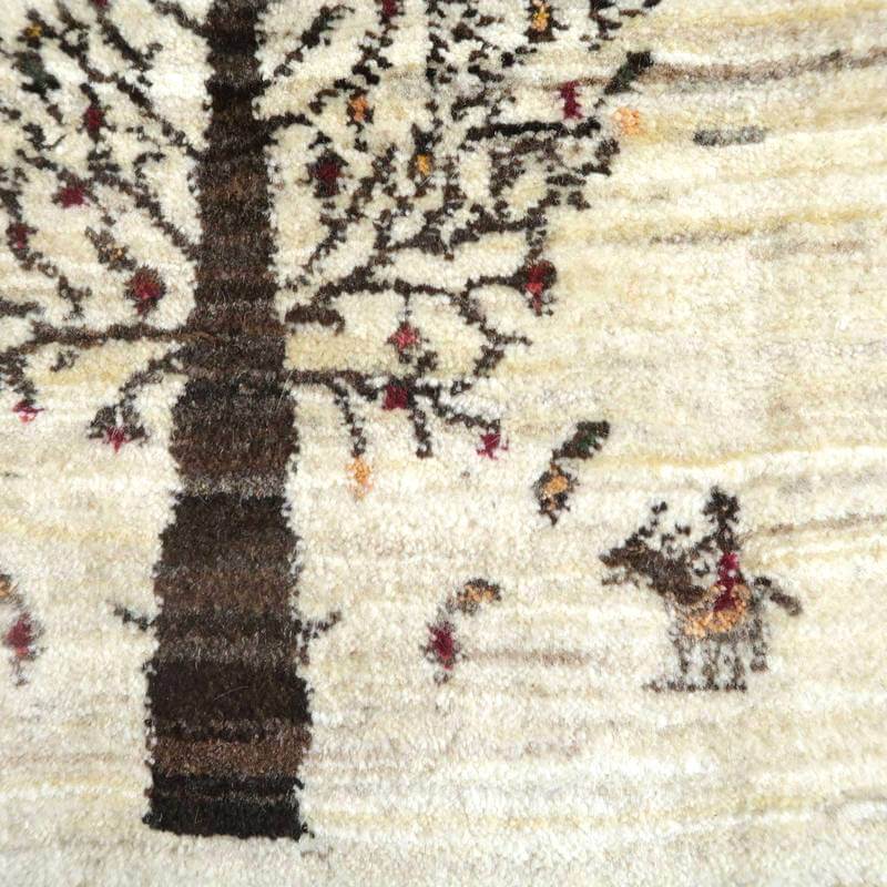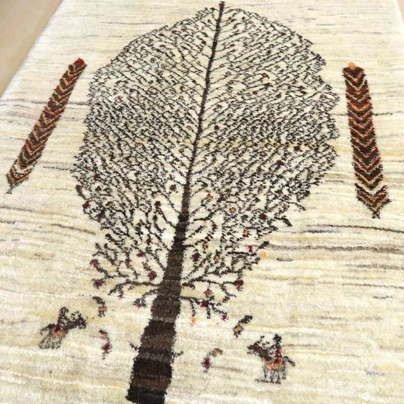 羊の毛色をそのまま活かした無染色の羊色のベースには、美しいグラデーションの色の揺らぎがあります。中心にはこんもりと茂る大きな生命の木とその下には馬に乗った女性が描かれています。樹形のユニークさが魅力的なギャッベです。