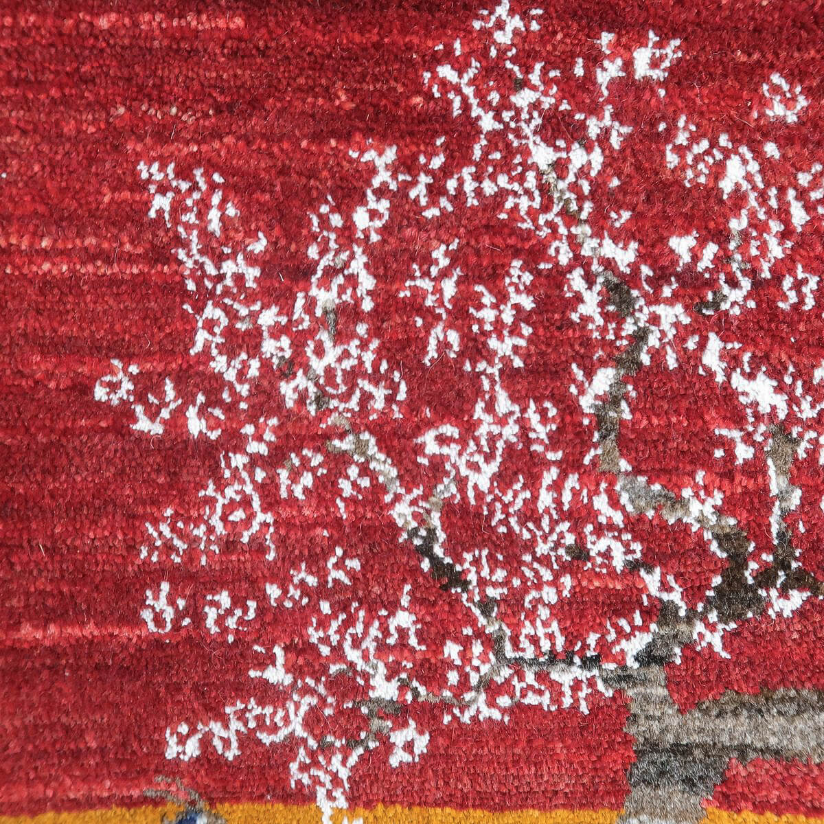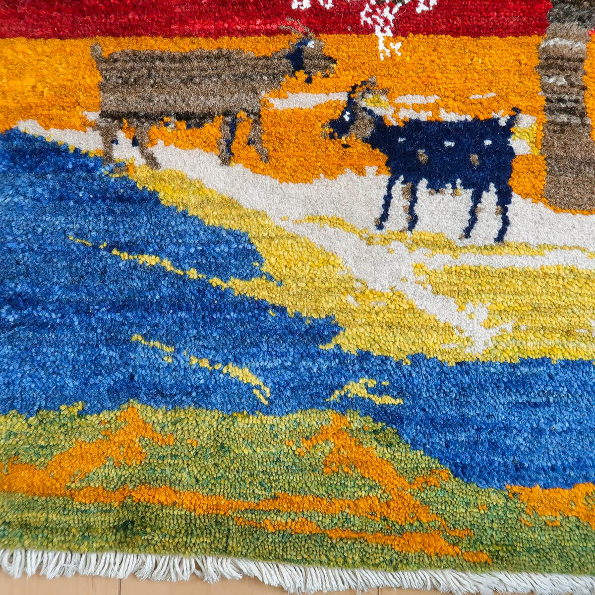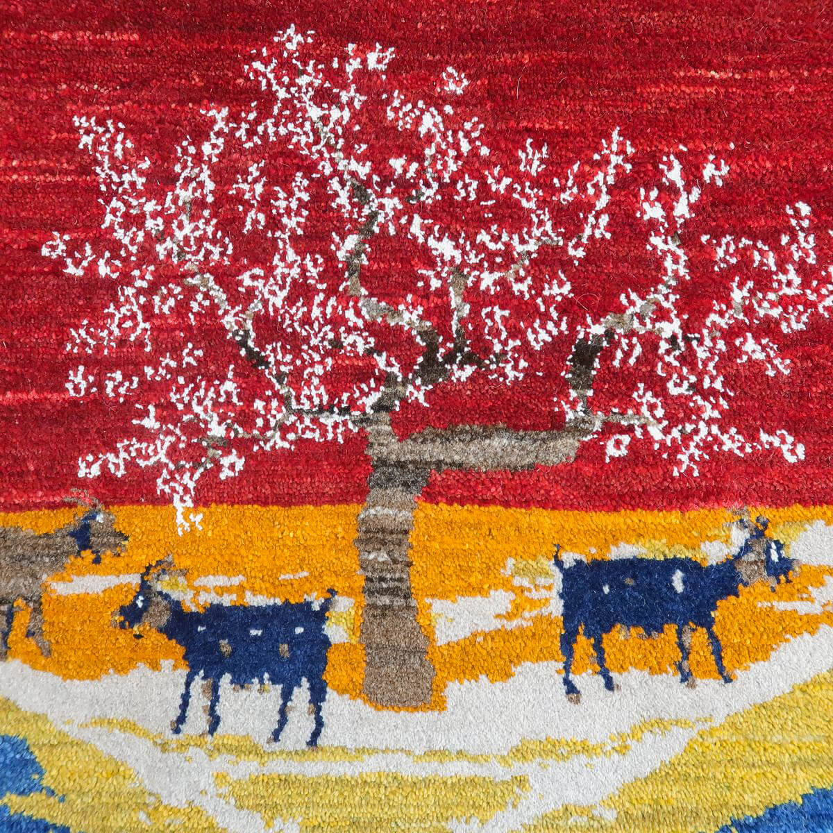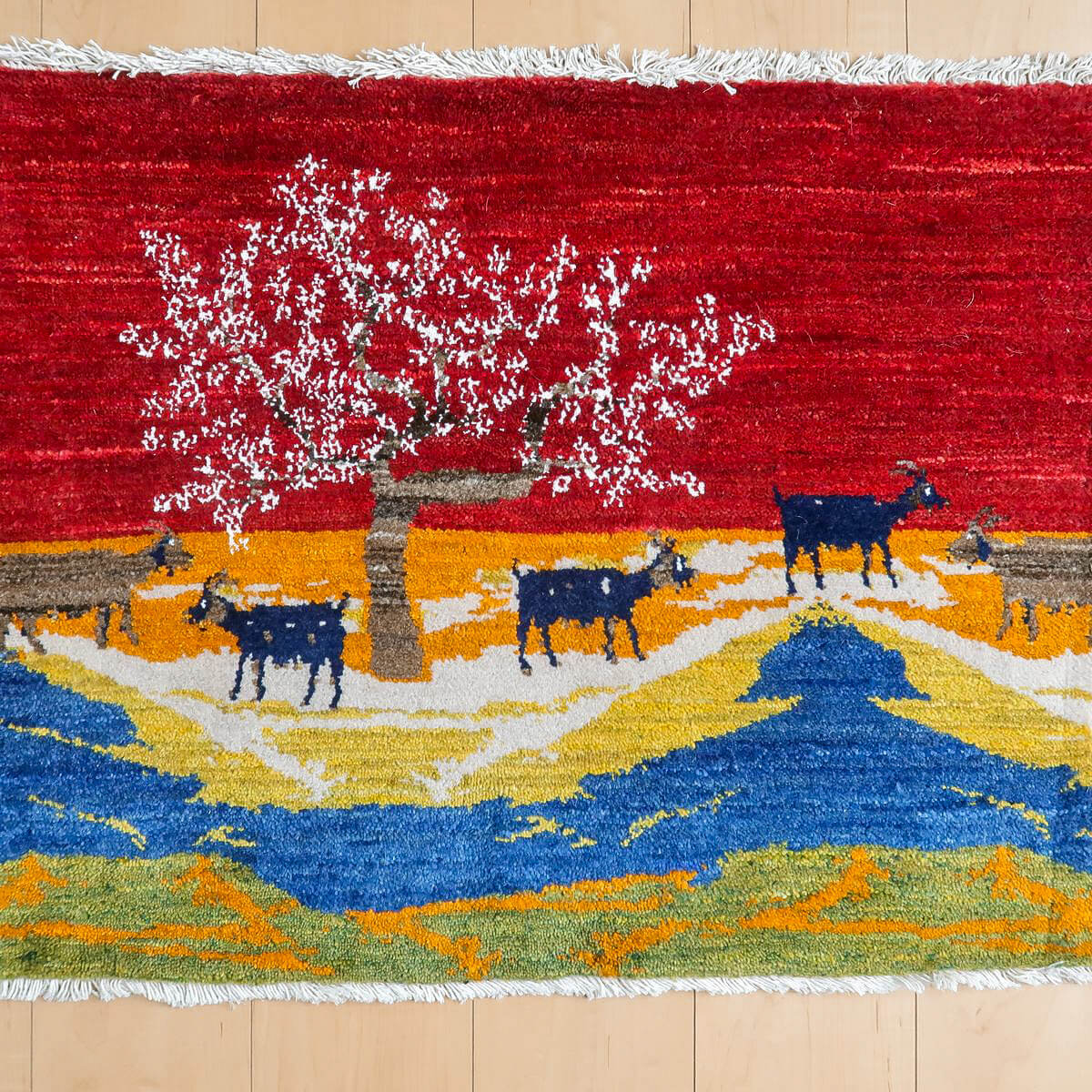 真っ赤な夕焼け空の下、満開の木の下でのんびりする山羊や羊たちを写し取ったランドスケープ柄のギャッベ。地面の起伏が細やかに描写された繊細な描写で絵のように楽しんでいただけます。