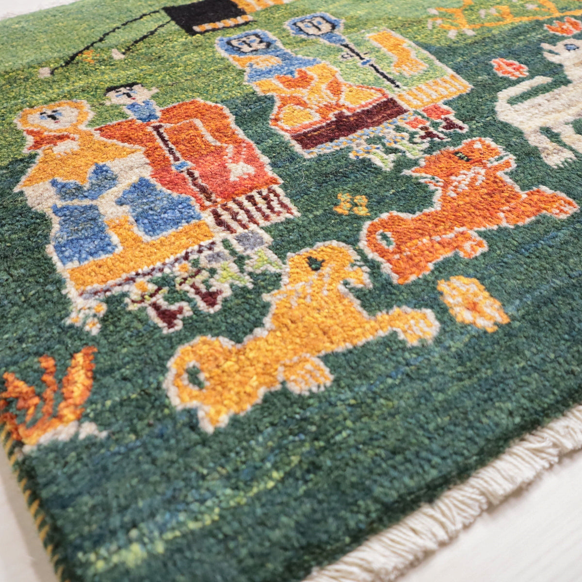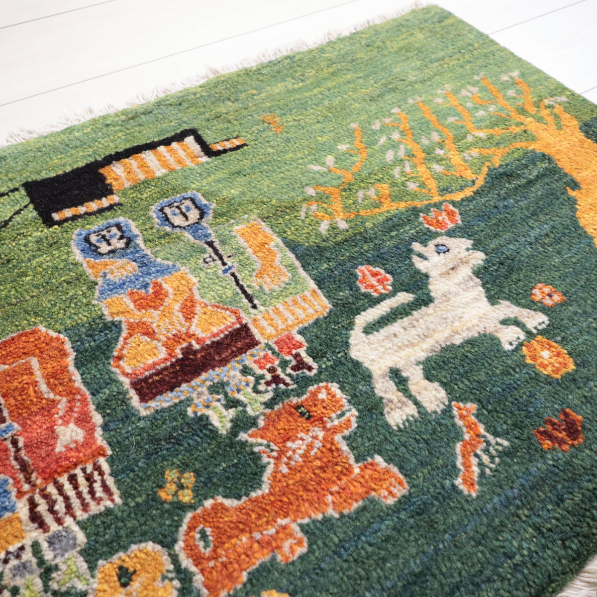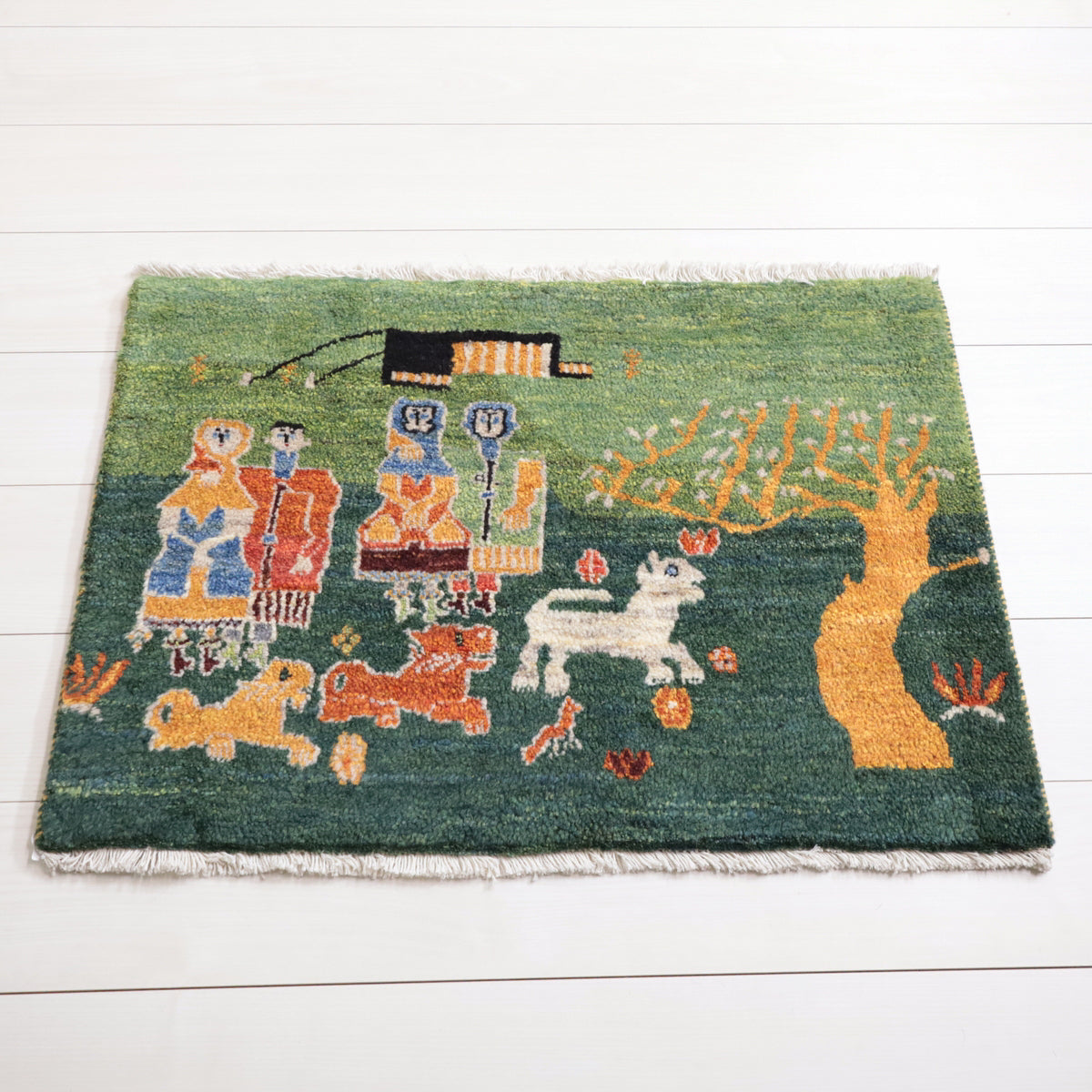 緑の背景に、鮮やかな色彩で描かれた人物や動物たちが生き生きと描かれたギャッベ。赤や青、黄色の伝統的な衣装を纏った人物が印象的に配置され、周りには白い動物や黄色の樹木が描かれています。カラフルな色使いと緻密なデザインが、お部屋に楽しい雰囲気をもたらしてくれる一枚です。