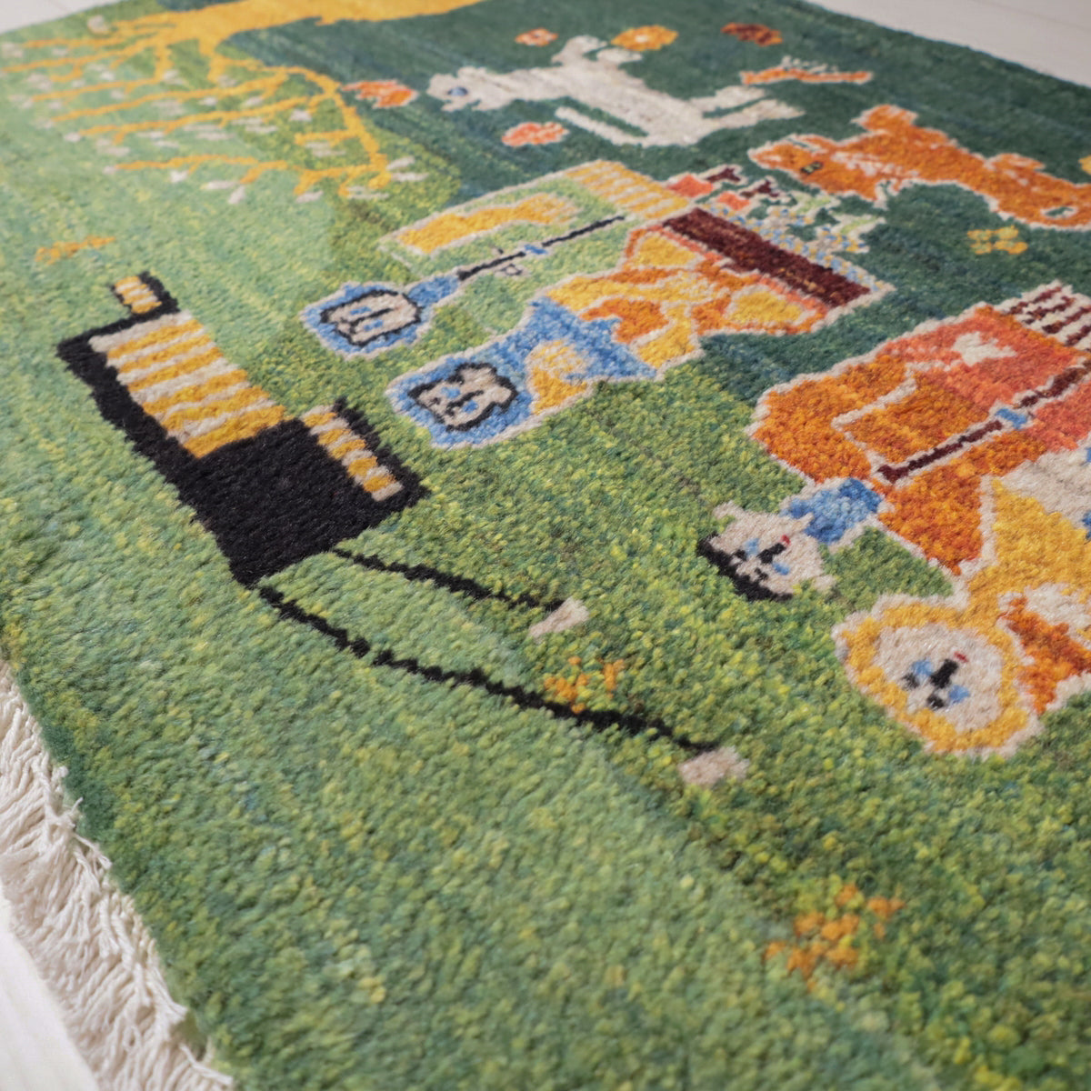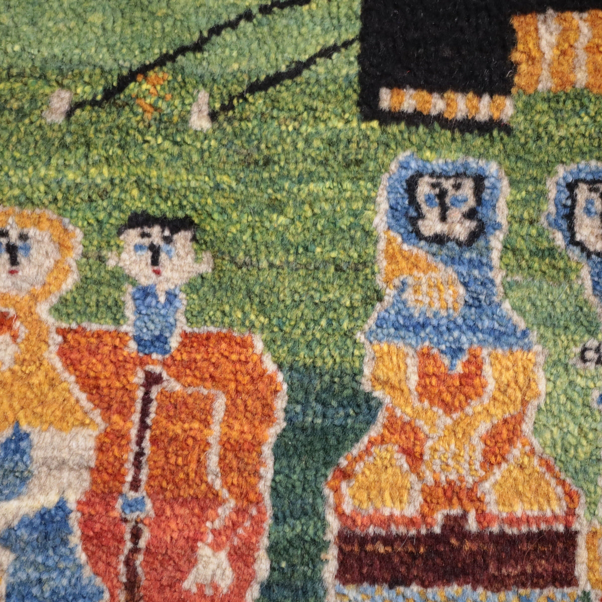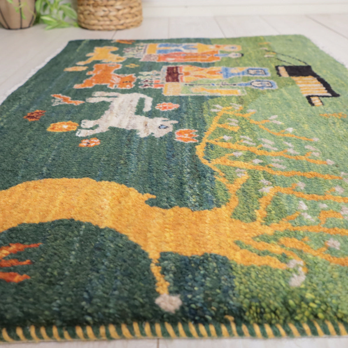 緑の背景に、鮮やかな色彩で描かれた人物や動物たちが生き生きと描かれたギャッベ。赤や青、黄色の伝統的な衣装を纏った人物が印象的に配置され、周りには白い動物や黄色の樹木が描かれています。カラフルな色使いと緻密なデザインが、お部屋に楽しい雰囲気をもたらしてくれる一枚です。