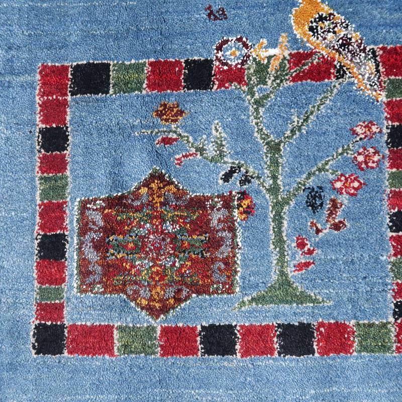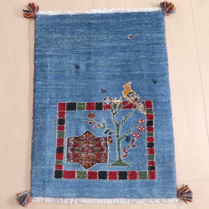 落ち着きのある爽やかなブルーのグラデーション。生命の木にとまる鳥が詩的な雰囲気で描かれています。詩の国イランらしい詩集の挿絵のようなモダンなギャッベです。絵としても飾れるデザイン。