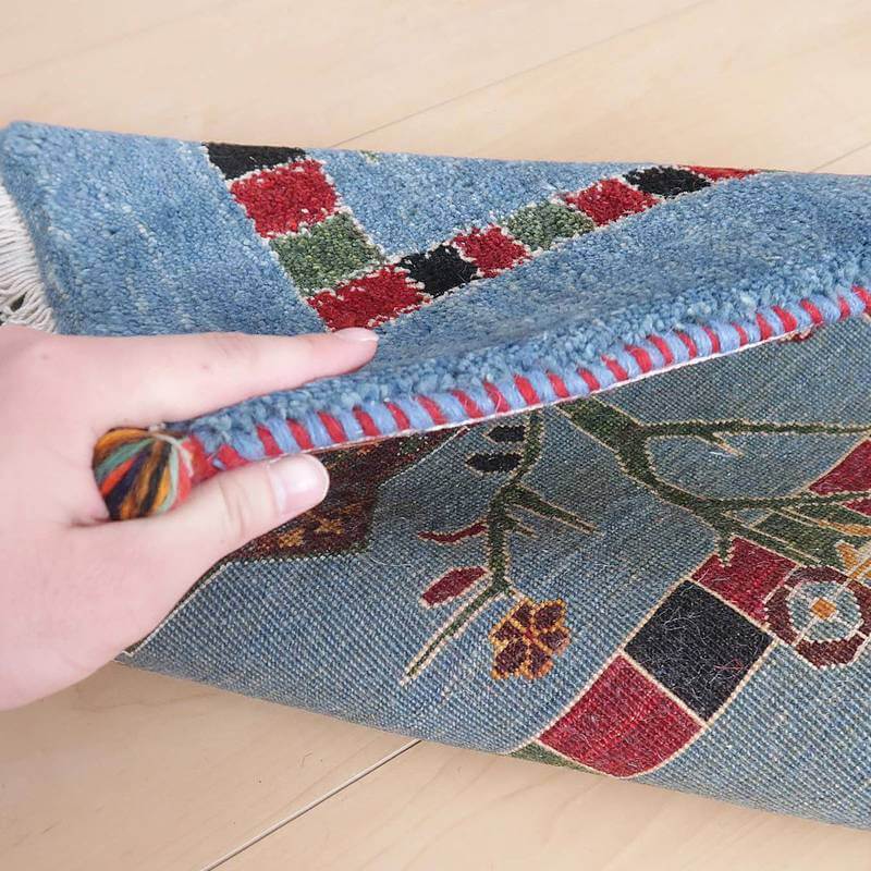織りは、10cmあたり、およそ40から45目という普通のギャッベの数倍にもなる大変細かなルリバフ。抜け毛が少なく、手触りはふわりと柔らか。踏んだ時やんわりと沈み込む踏み心地です。腕の良い選りすぐられた織り子だけが手掛ける極上の手仕事です。