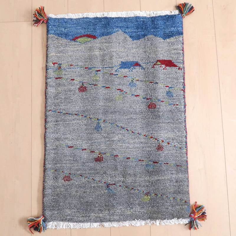 山並みと太陽と遊牧民のテント、そして、いくつかの斜めのラインは、結婚式の時に飾り付けられるカラフルなライトをモチーフにしています。楽しい思い出を表したギャッベなのだと思います。グレーを基調とした落ち着いたトーンのギャッベです。