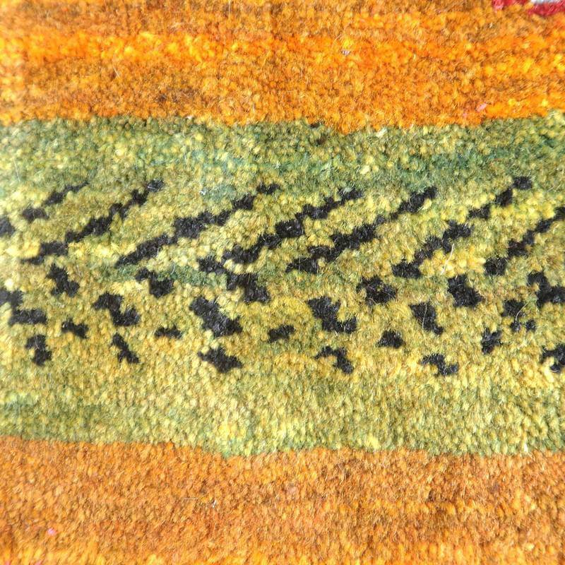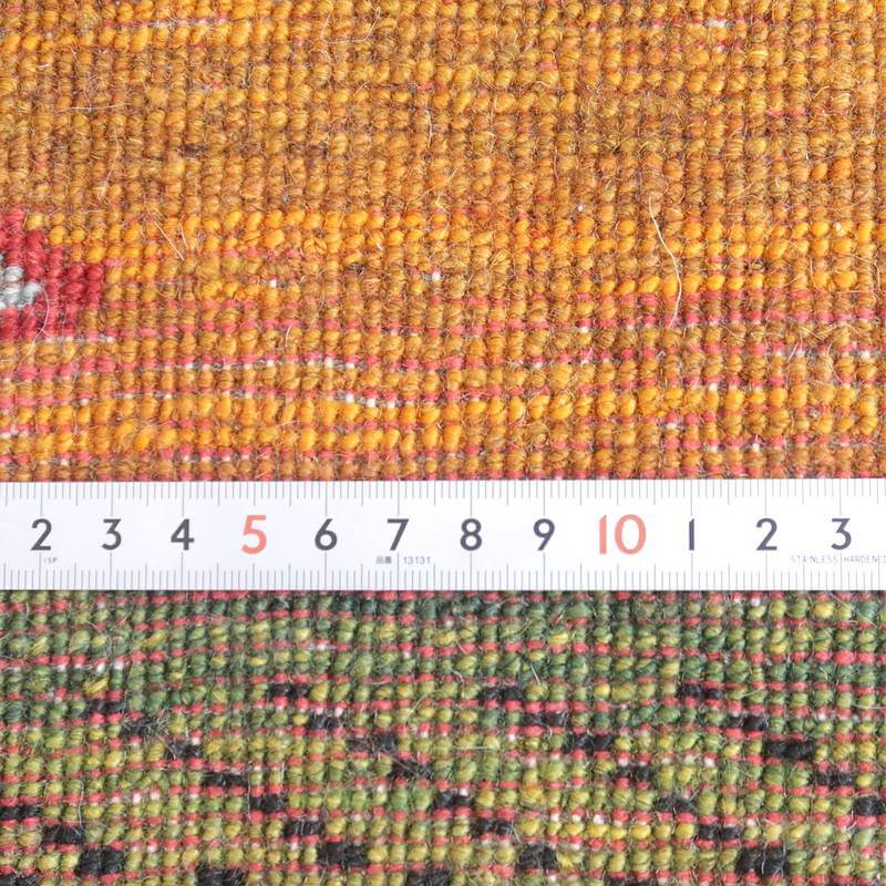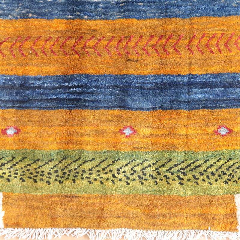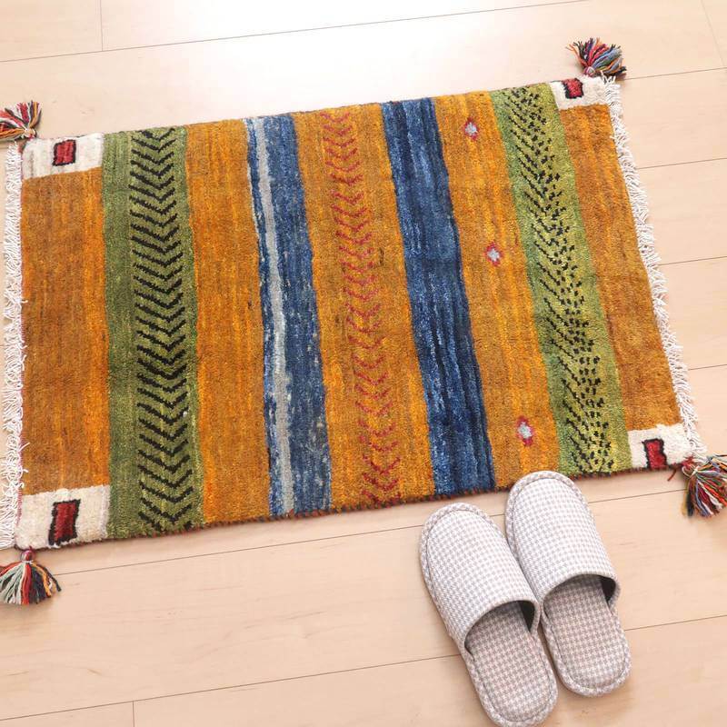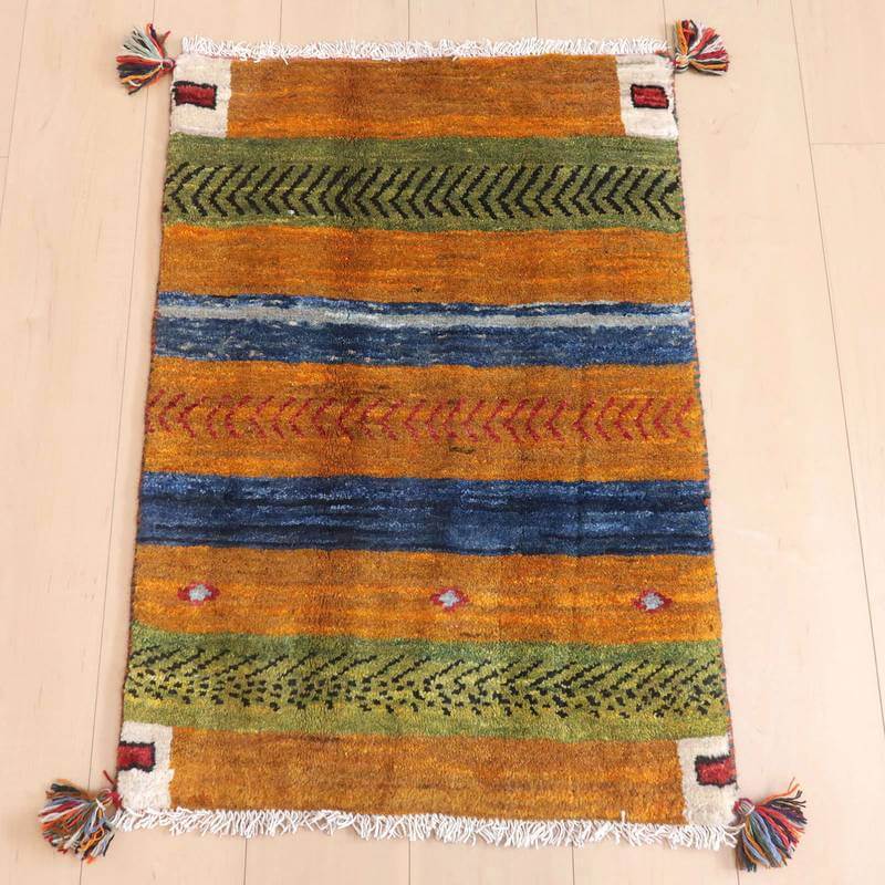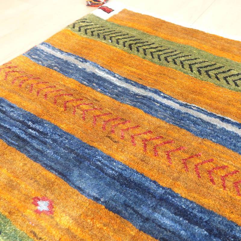 山吹色、グリーン、ブルーのアースカラーを重ねたボーダーデザインは、風景のような広がりが感じられます。シンプルながら温かみのある雰囲気のギャッベです。