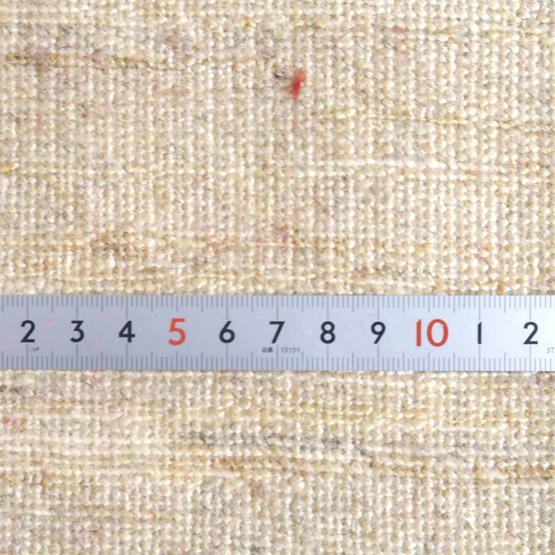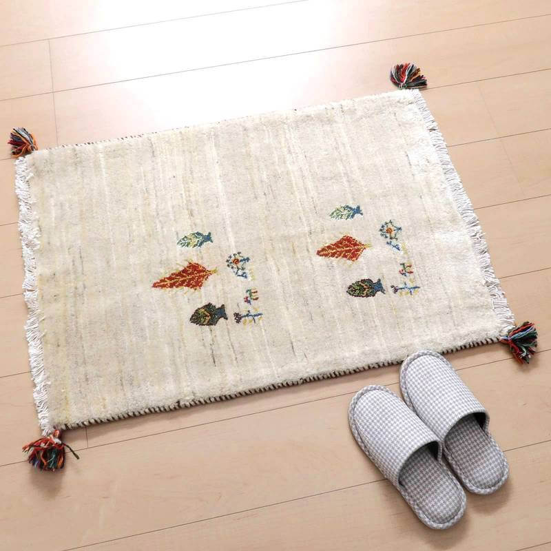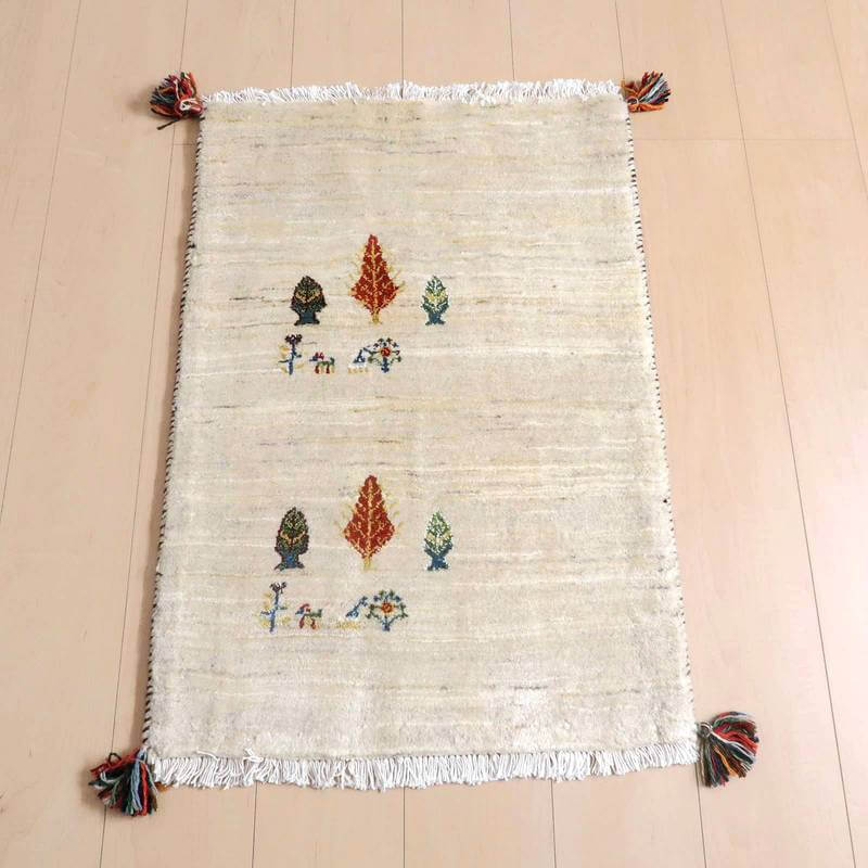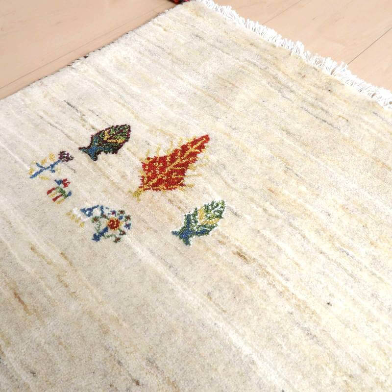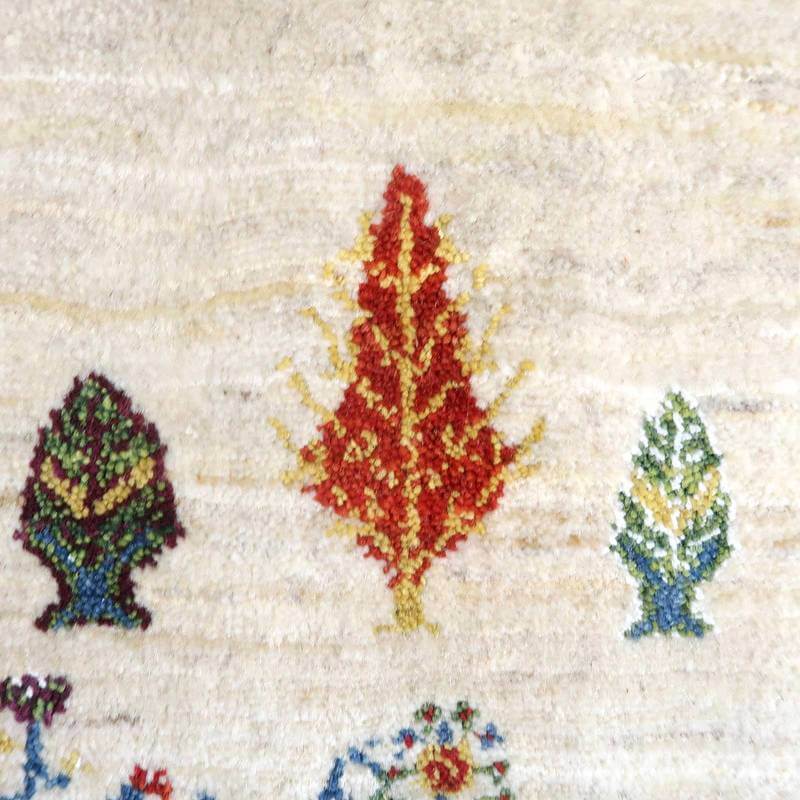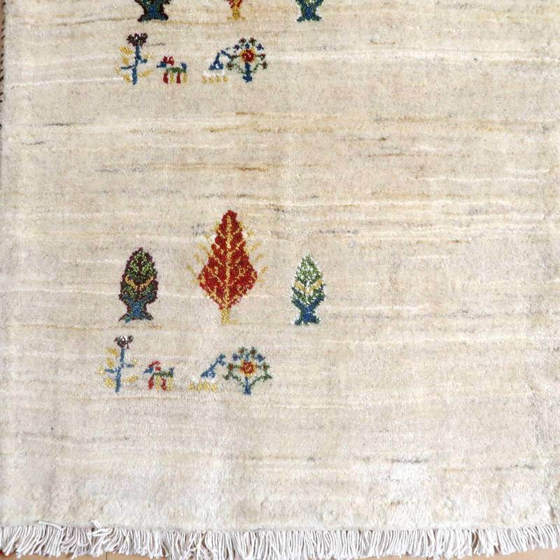 羊の毛色をそのまま活かした無染色の羊色で、ナチュラルな雰囲気がより大きく感じられます。薄グレーや薄ベージュの広がりのある景色をイメージさせるやんわりしたグラデーションに生命の木や動物が入った、絵本のような明るい雰囲気のギャッベです。