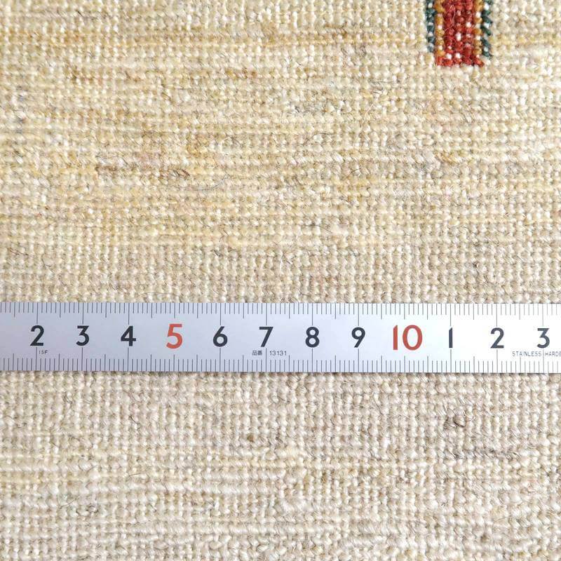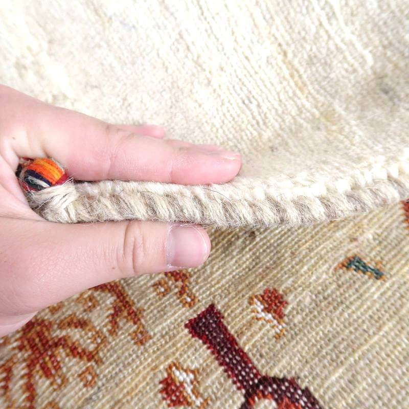 織りは、10cmあたり、およそ40から45目という普通のギャッベの数倍にもなる大変細かなルリバフ。抜け毛が少なく、手触りはふわりと柔らか。踏んだ時やんわりと沈み込む踏み心地です。腕の良い選りすぐられた織り子だけが手掛ける極上の手仕事です。