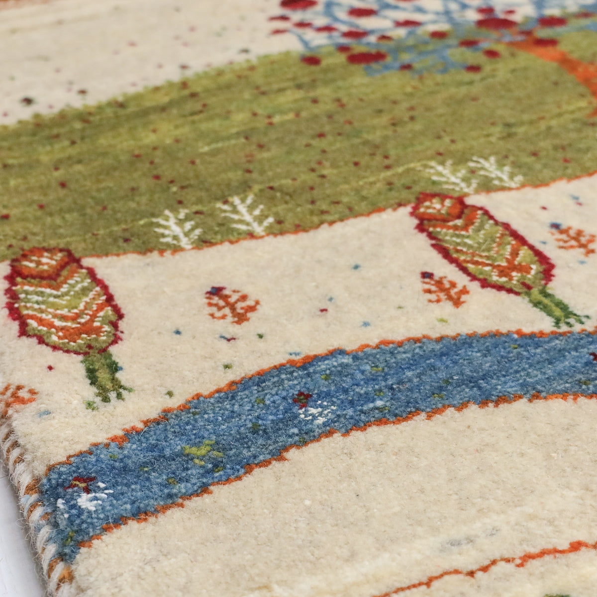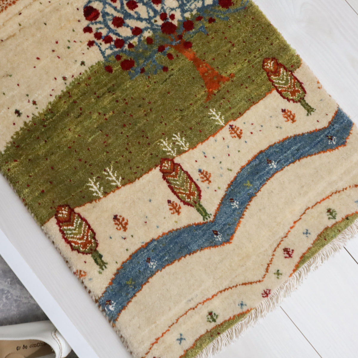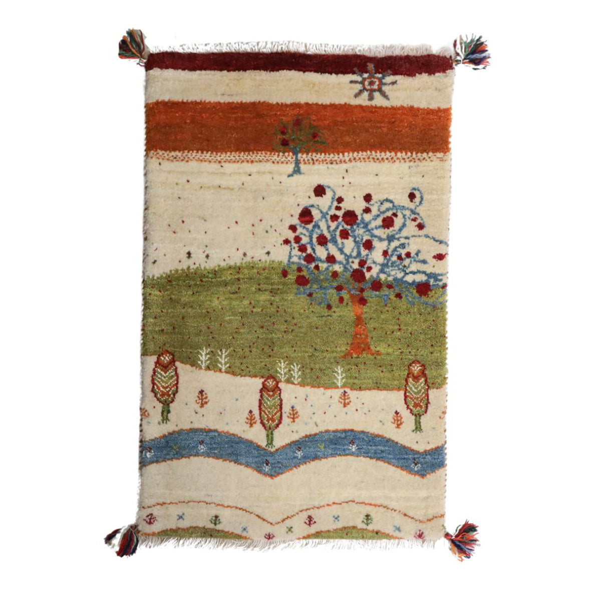 羊の毛色をそのまま活かした無染色の羊色で、ナチュラルな雰囲気がより大きく感じられます。緑の草原と太陽の照り返し、広がりのある風景をギャッベに写しとった絵本の挿絵のような幻想的な雰囲気のある美しいランドスケープデザインです。