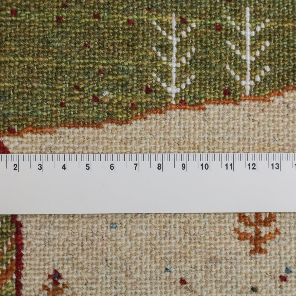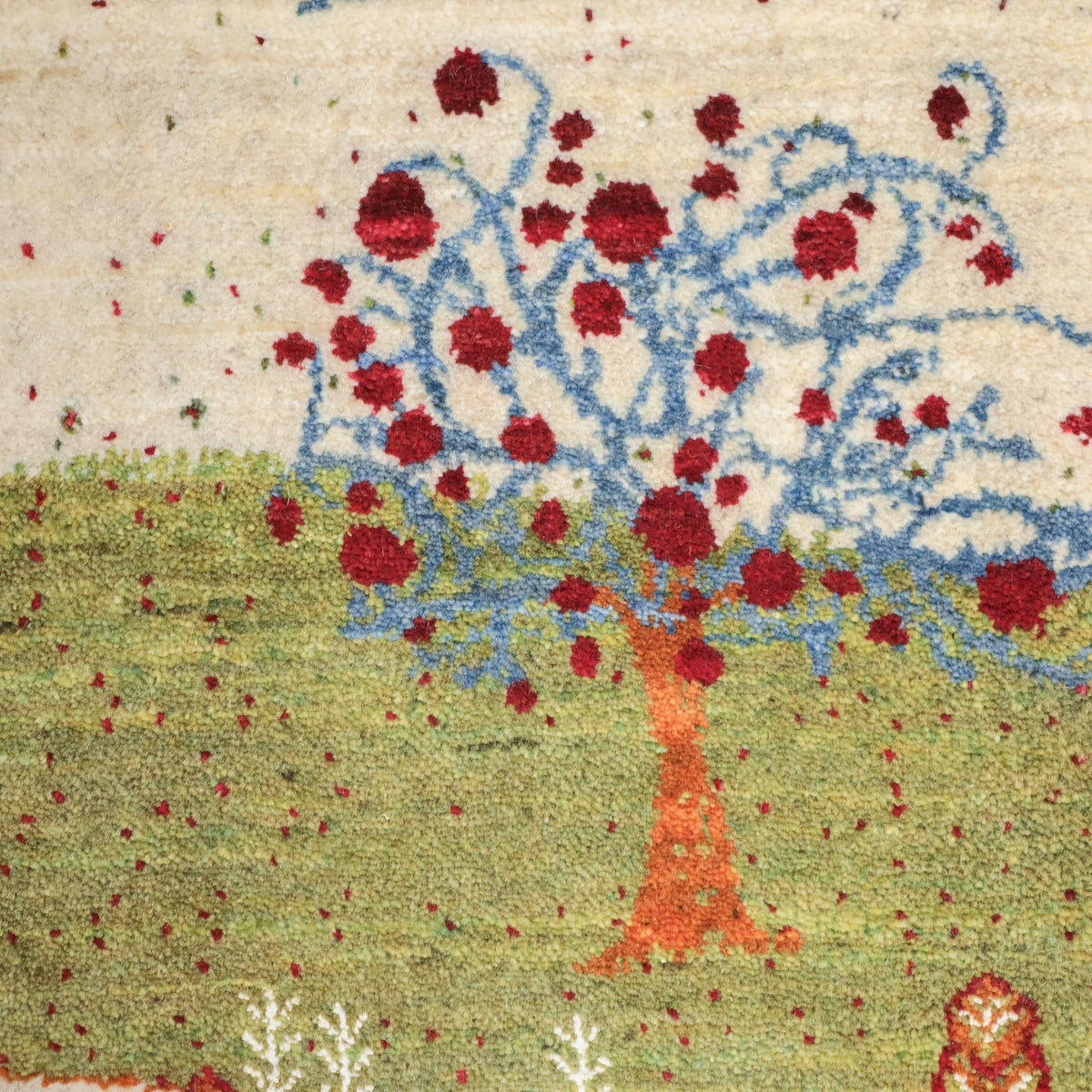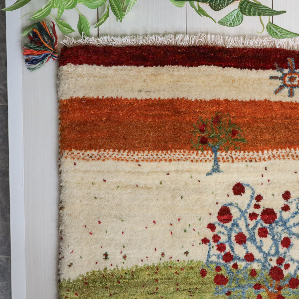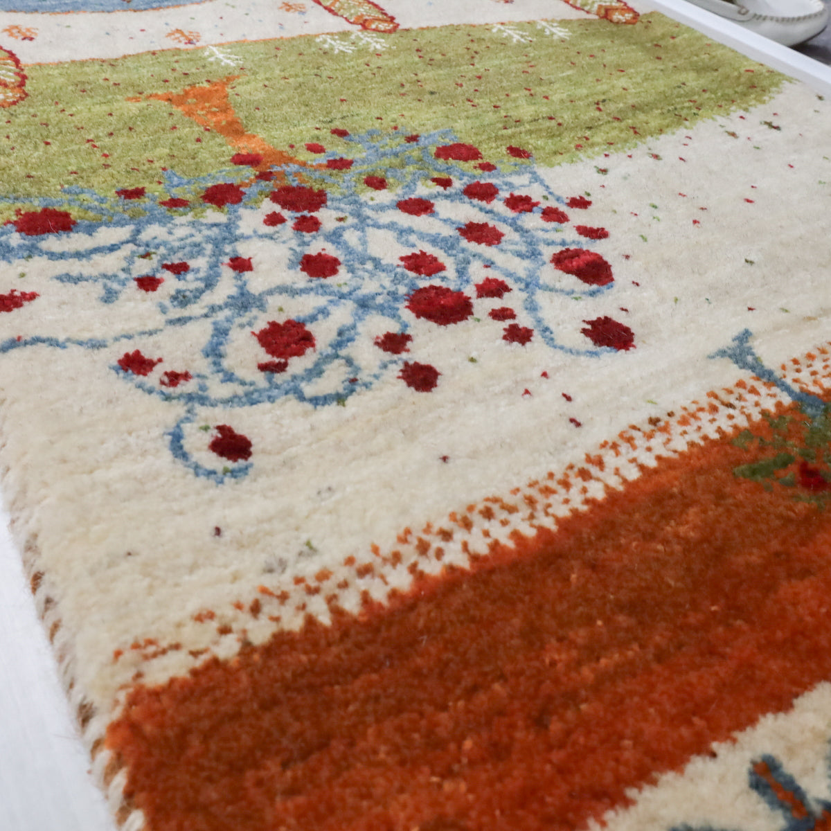 羊の毛色をそのまま活かした無染色の羊色で、ナチュラルな雰囲気がより大きく感じられます。緑の草原と太陽の照り返し、広がりのある風景をギャッベに写しとった絵本の挿絵のような幻想的な雰囲気のある美しいランドスケープデザインです。