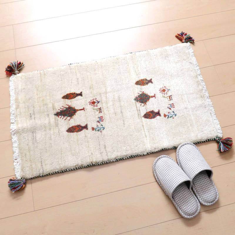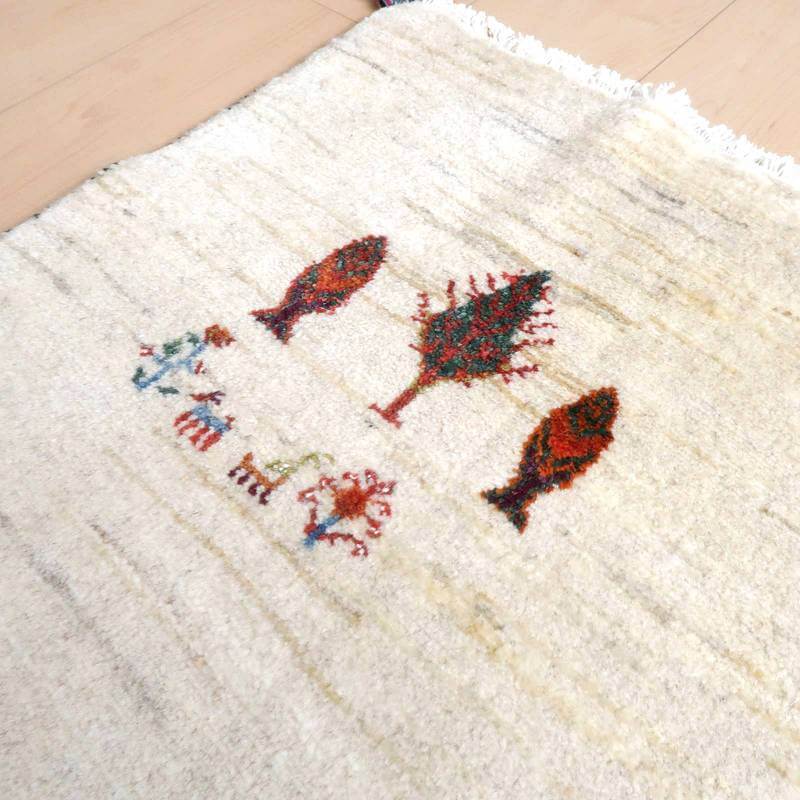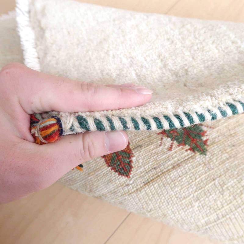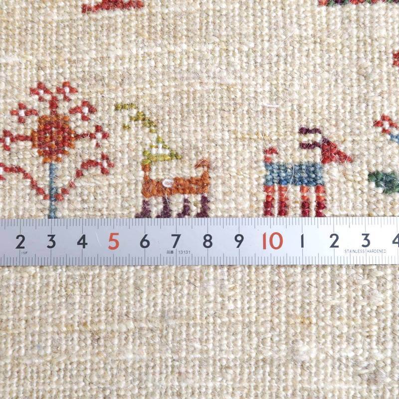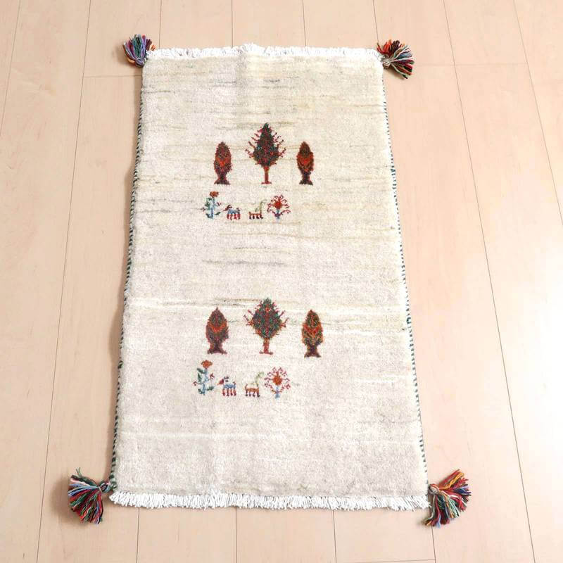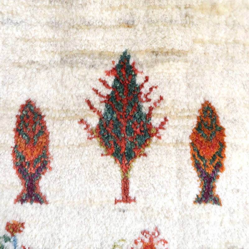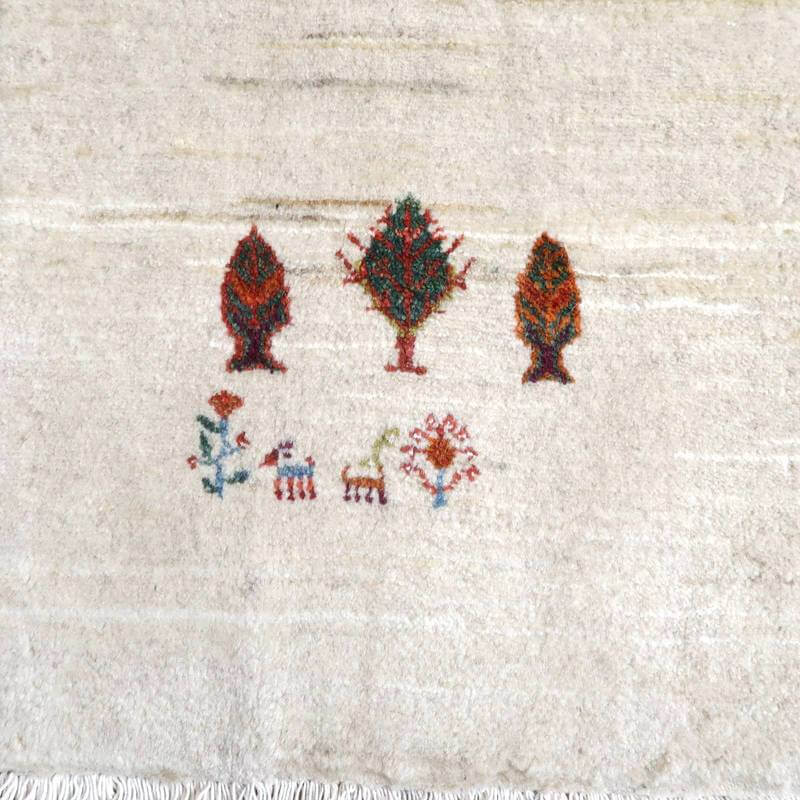 羊の毛色をそのまま活かした無染色の羊色で、ナチュラルな雰囲気がより大きく感じられます。薄グレーや薄ベージュの広がりのある景色をイメージさせるやんわりしたグラデーションに生命の木や動物が入った、絵本のような明るい雰囲気のギャッベです。上端で48センチ、下端で50センチと横幅に手織りならではの違いがございます。