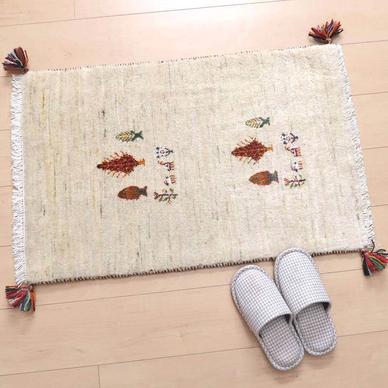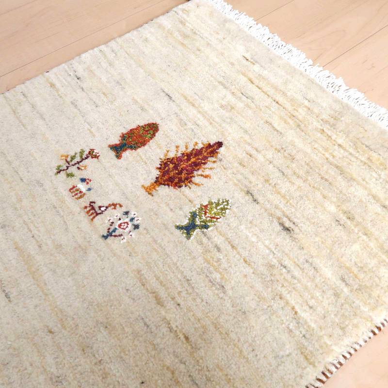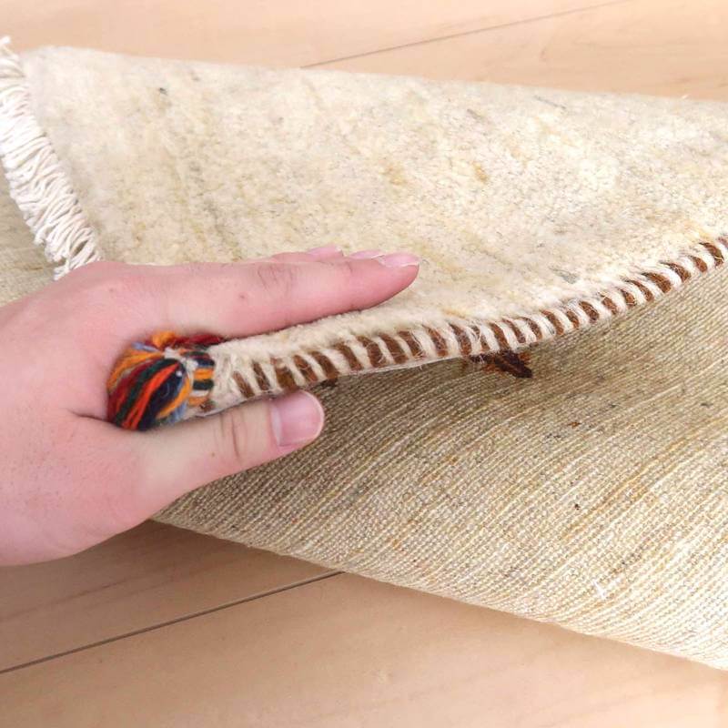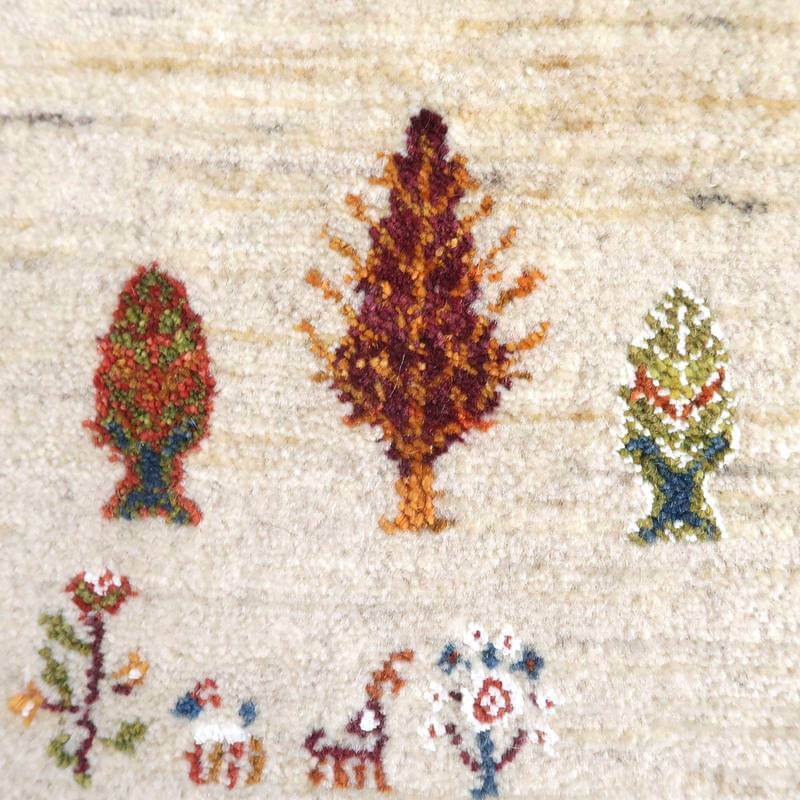 羊の毛色をそのまま活かした無染色の羊色で、ナチュラルな雰囲気がより大きく感じられます。薄グレーや薄ベージュの広がりのある景色をイメージさせるやんわりしたグラデーションに生命の木や動物が入った、絵本のような明るい雰囲気のギャッベです。デザインを引き立てるため部分的にコットンシルクが使われています。