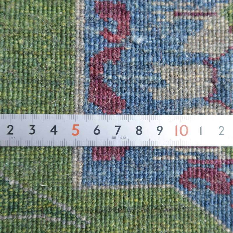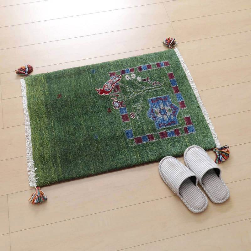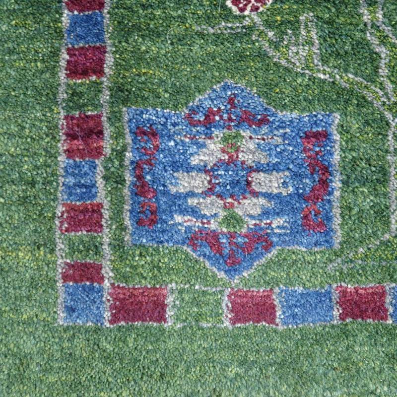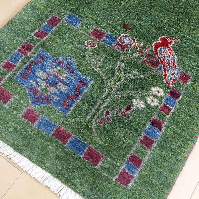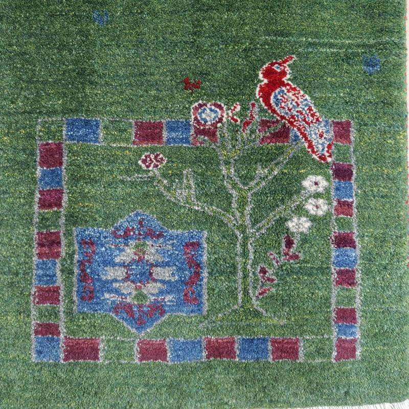 濃淡の細かなアブラシ(グラデーション)が綺麗なグリーン、生命の木にとまる鳥が詩的な雰囲気で描かれています。詩の国イランらしい詩集の挿絵のようなモダンなギャッベです。絵としても飾れるデザイン。右端で75センチ、左端で78センチと長さに手織りならではの少しの違いがございます。
