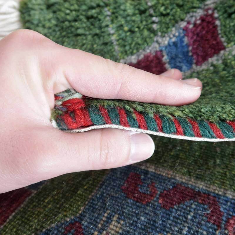 織りは、10cmあたり、およそ40から45目という普通のギャッベの数倍にもなる大変細かなルリバフ。抜け毛が少なく、手触りはふわりと柔らか。踏んだ時やんわりと沈み込む踏み心地です。腕の良い選りすぐられた織り子だけが手掛ける極上の手仕事です。