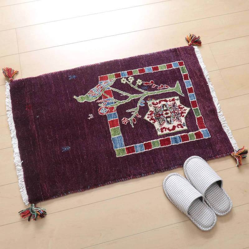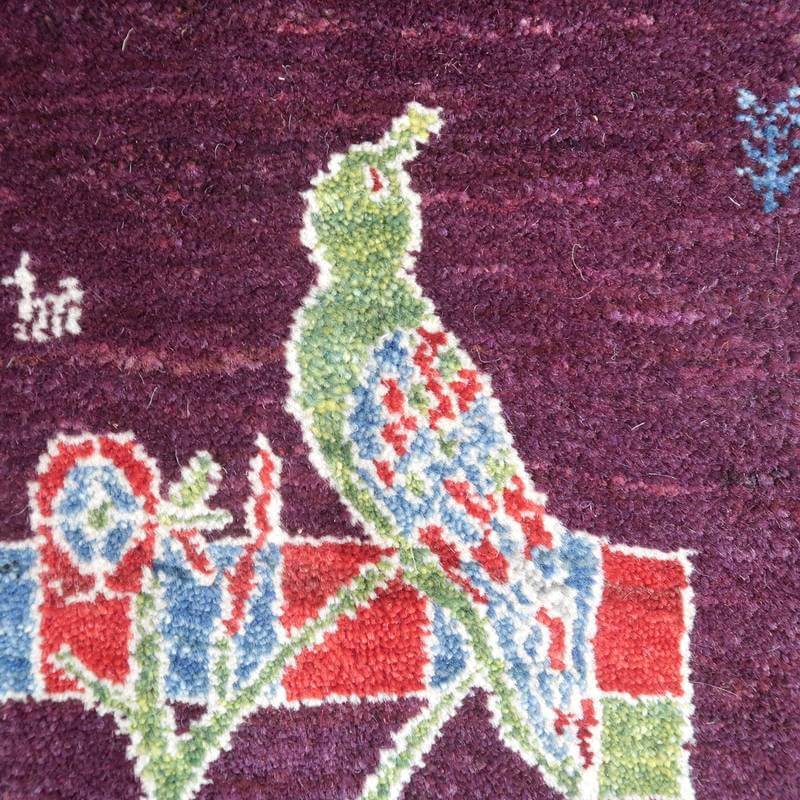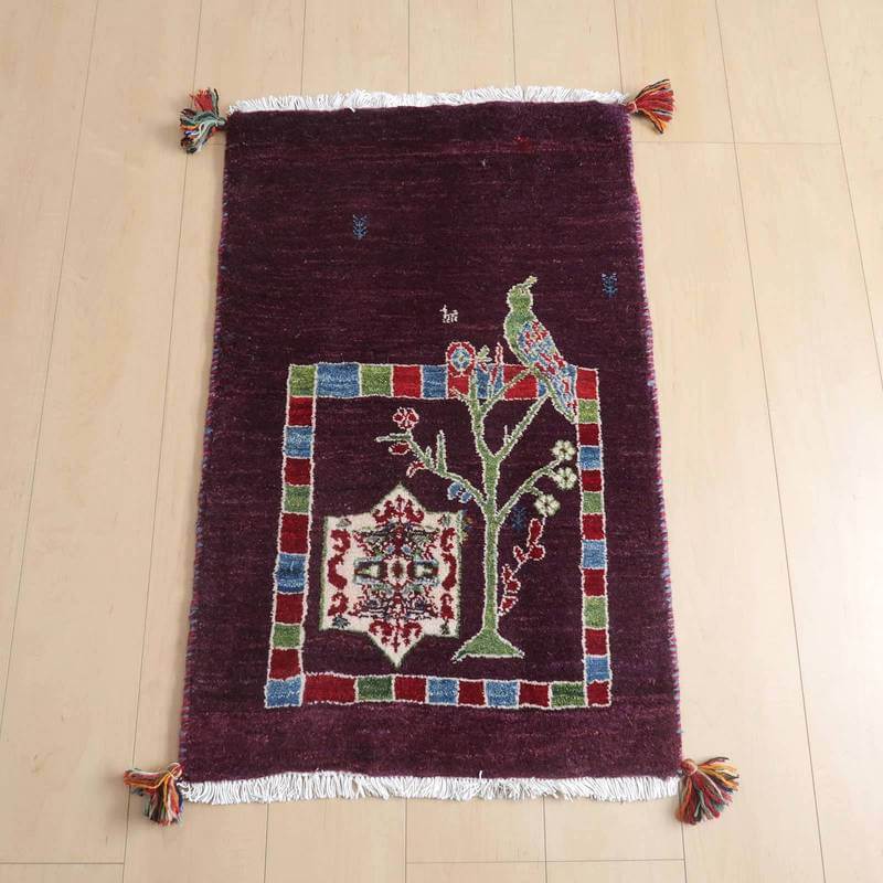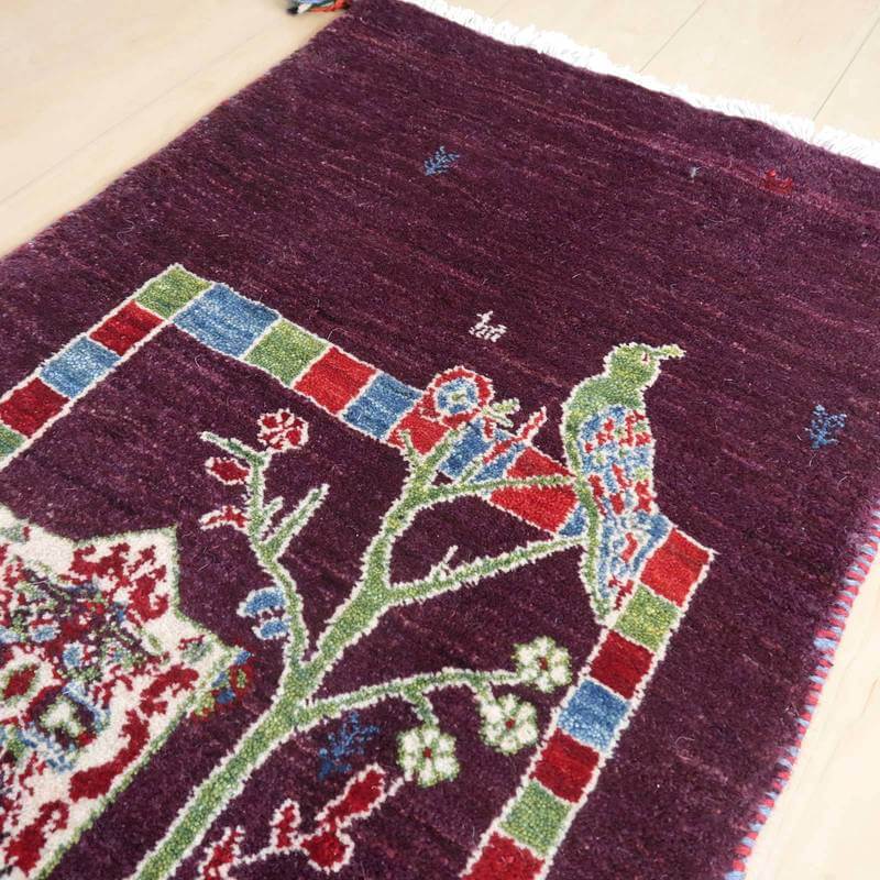濃い紫色のやんわりしたグラデーションを背景に、生命の木にとまる鳥が詩的な雰囲気で描かれています。詩の国イランらしい詩集の挿絵のようなモダンなギャッベです。絵としても飾れるデザイン。右端で89センチ、左端で87センチと長さに手織りならではの違いがございます。