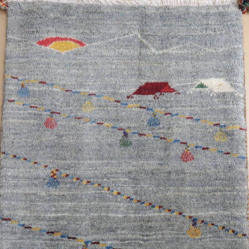 山並みと太陽と2つのテント、そして、いくつかの斜めのラインは、結婚式の時に飾り付けられるカラフルなライトをモチーフにしています。楽しい思い出を表したギャッベなのだと思います。グレーを基調としたシックな色のギャッベです。