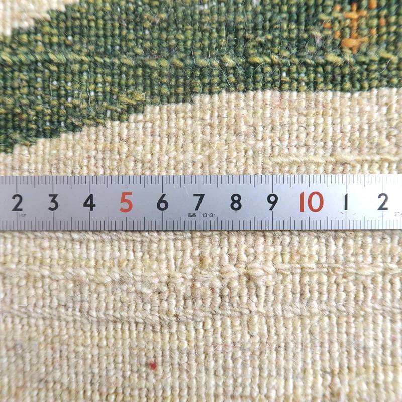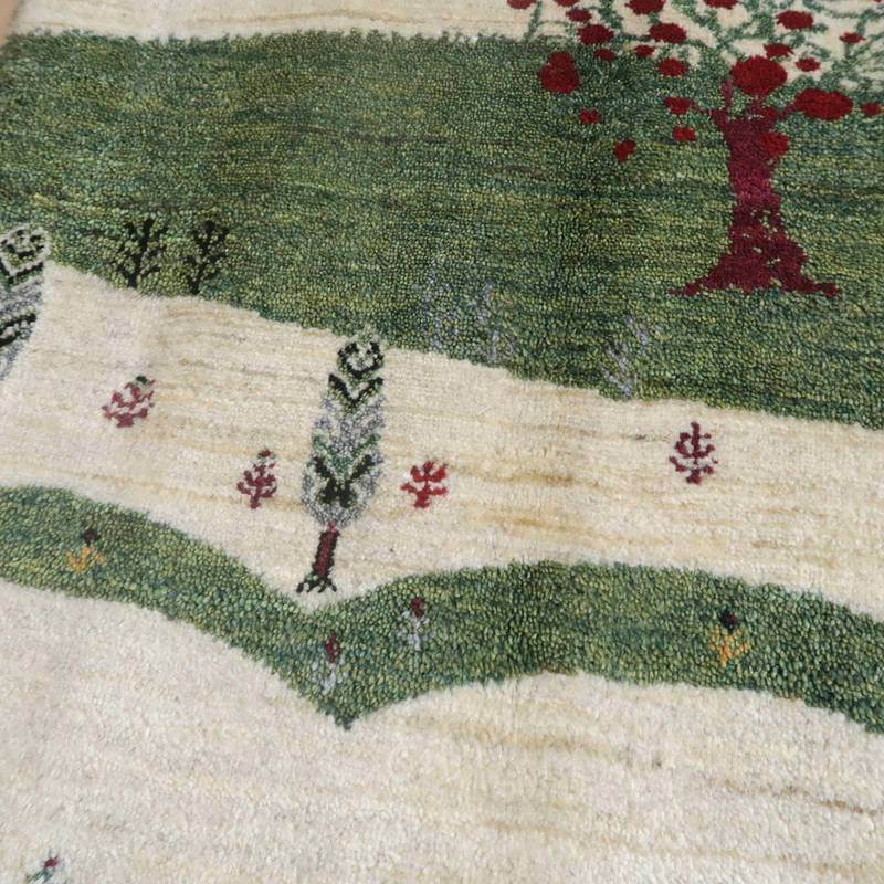 羊の毛色をそのまま活かした無染色の羊色、赤、グリーンがベースとなった穏やかな色調。緑の草原と太陽の照り返し、広がりのある風景をギャッベに写しとった美しいランドスケープデザインです。おとぎ話の挿絵のような幻想的な雰囲気も感じられます。絵としても飾れるデザイン。左右の長さに1、2センチの差がございます。