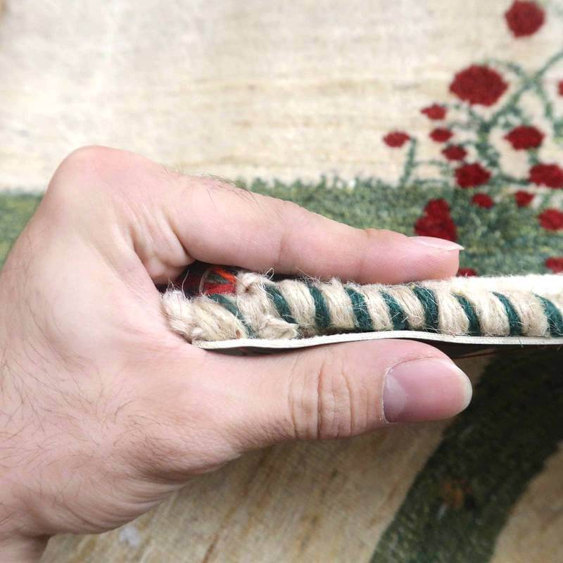 織りは、10cmあたり、およそ40から45目という普通のギャッベの数倍にもなる大変細かなルリバフ。抜け毛が少なく、手触りはふわりと柔らか。踏んだ時やんわりと沈み込む踏み心地です。腕の良い選りすぐられた織り子だけが手掛ける極上の手仕事です。