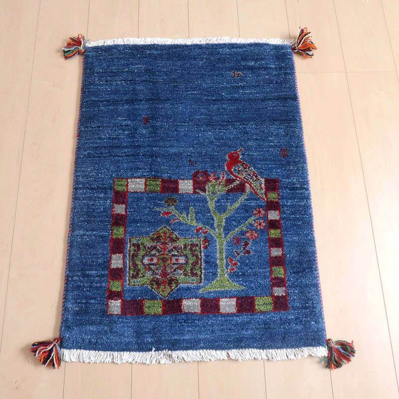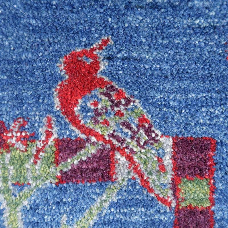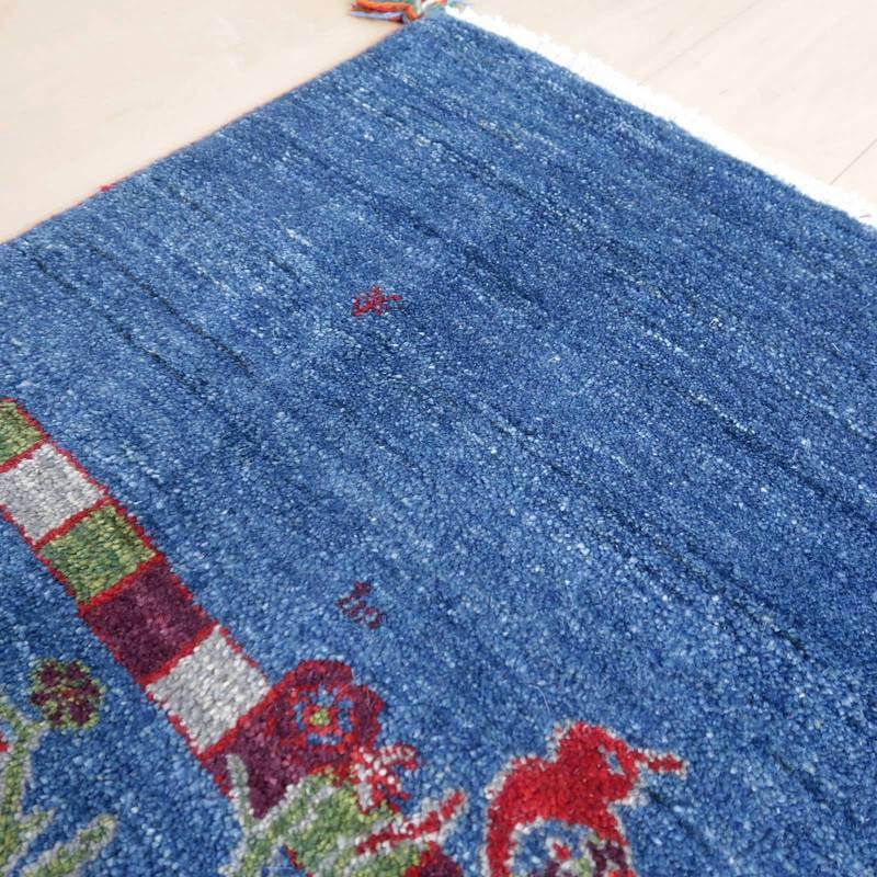落ち着きのある爽やかなブルーのグラデーション。生命の木にとまる鳥が詩的な雰囲気で描かれています。詩の国イランらしい詩集の挿絵のようなモダンなギャッベです。絵としても飾れるデザイン。