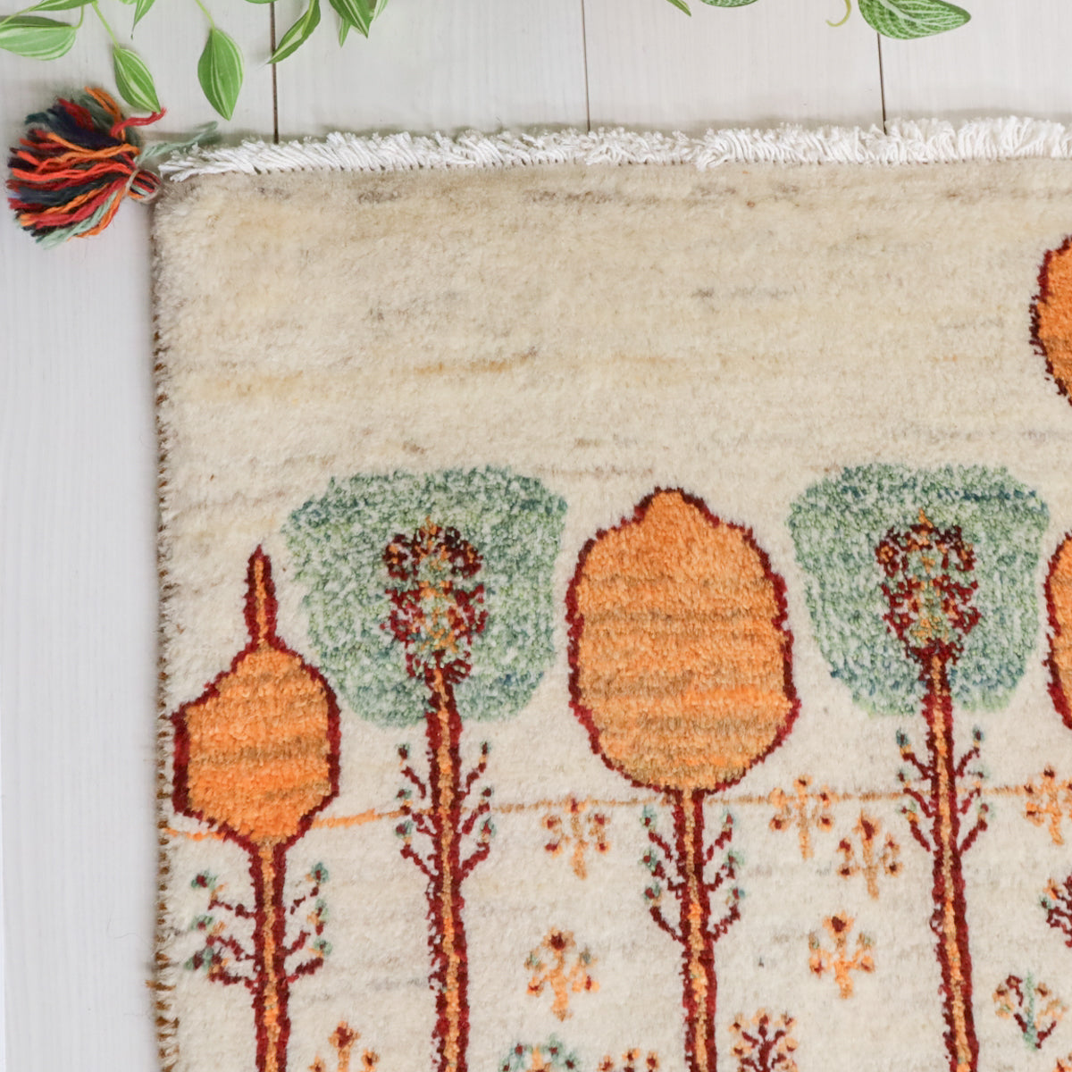 まっすぐ長く伸びた大きな花の様子がたいへんユニークなデザインです。花と動物のたくさん入った彩の豊かな可愛いギャッベ。