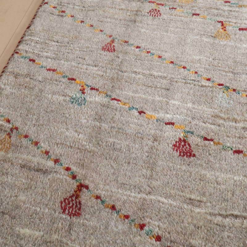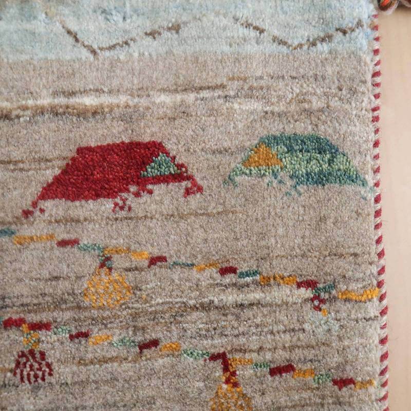 山並みと太陽と遊牧民のテント、そして、いくつかの斜めのラインは、結婚式の時に飾り付けられるカラフルなライトをモチーフにしています。楽しい思い出を表したギャッベなのだと思います。グレーベージュを基調とした落ち着いたトーンのギャッベです。