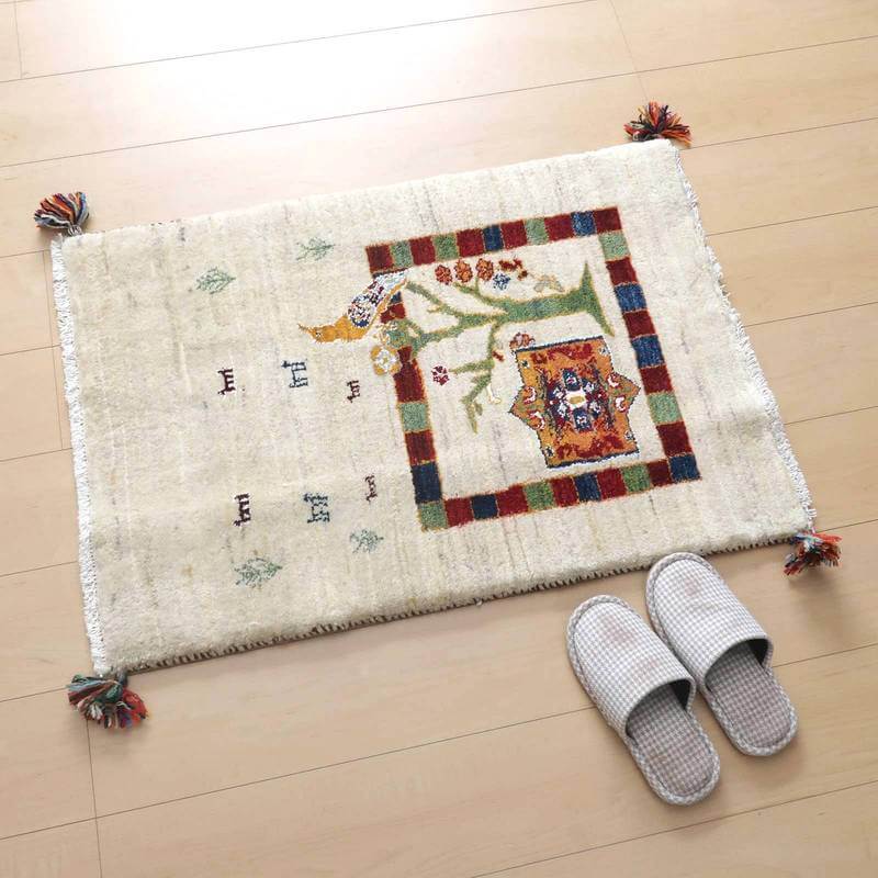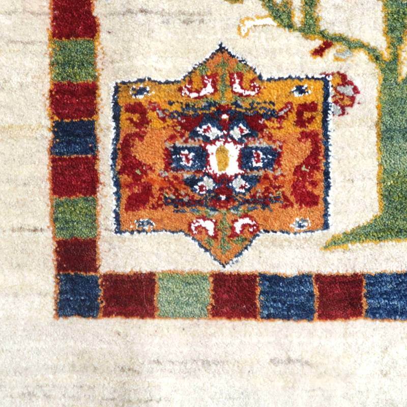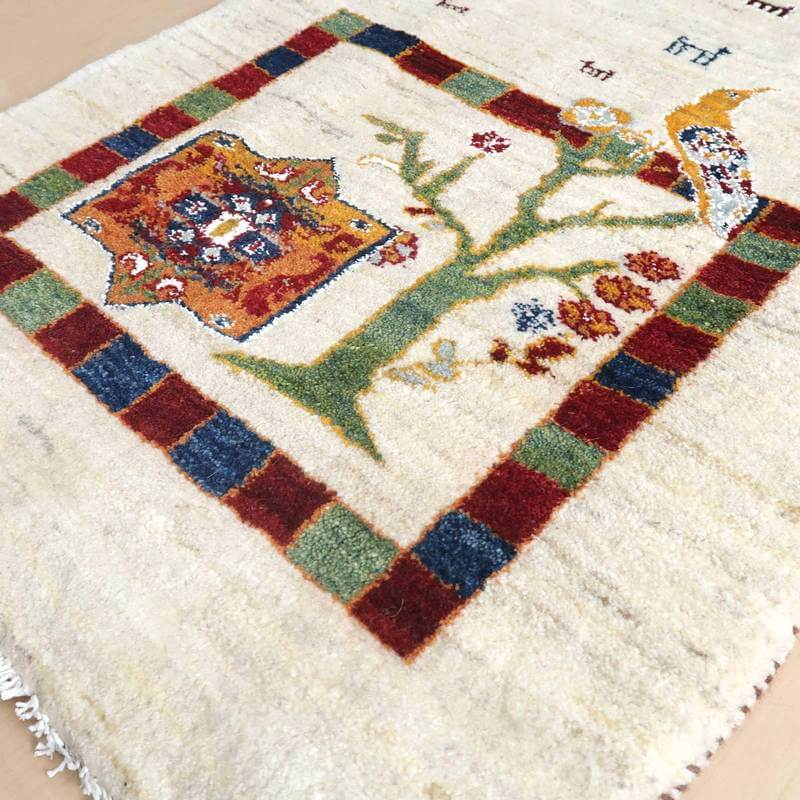 羊の毛色をそのまま活かした原毛のグラデーションが細かく入ったナチュラルなカラー。生命の木にとまる鳥が詩的な雰囲気で描かれています。詩の国イランらしい詩集の挿絵のようなモダンなギャッベです。