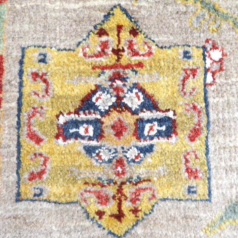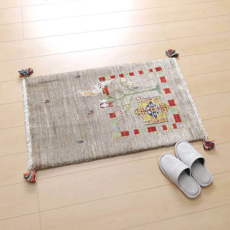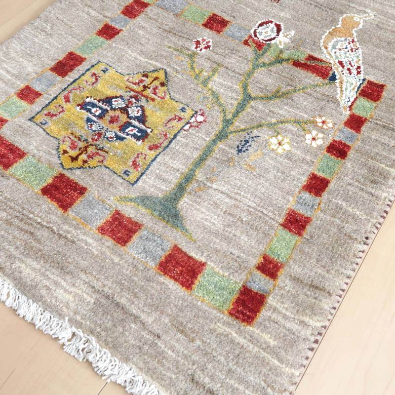 グレーやベージュなどの羊の毛色をそのまま活かした原毛のグラデーションが細かく入ったナチュラルなカラー。生命の木にとまる鳥が詩的な雰囲気で描かれています。詩の国イランらしい詩集の挿絵のようなモダンなギャッベです。絵としても飾れるデザイン。デザインを引き立てる為のコットンシルクが一部(特に白く見える部分)に使われています。