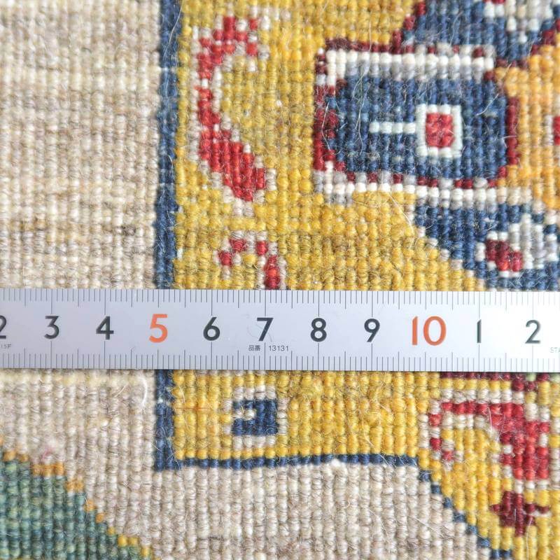 織りは、10cmあたり、およそ40から45目という普通のギャッベの数倍にもなる大変細かなルリバフ。抜け毛が少なく、手触りはふわりと柔らか。踏んだ時やんわりと沈み込む踏み心地です。腕の良い選りすぐられた織り子だけが手掛ける極上の手仕事です。