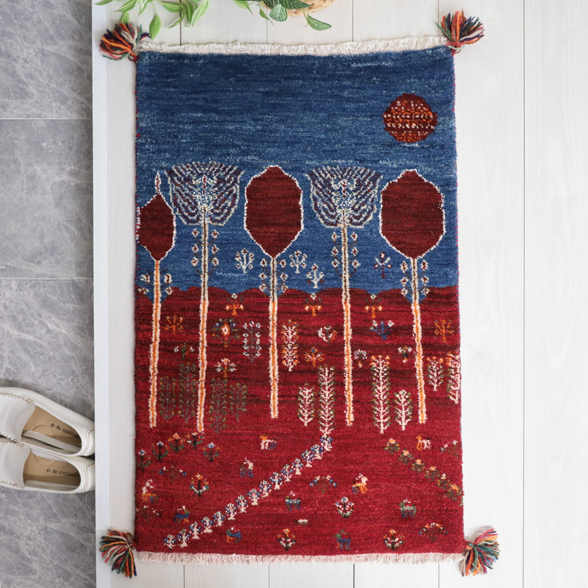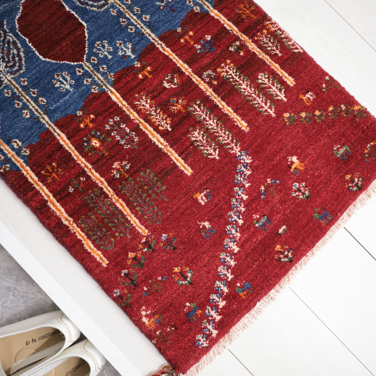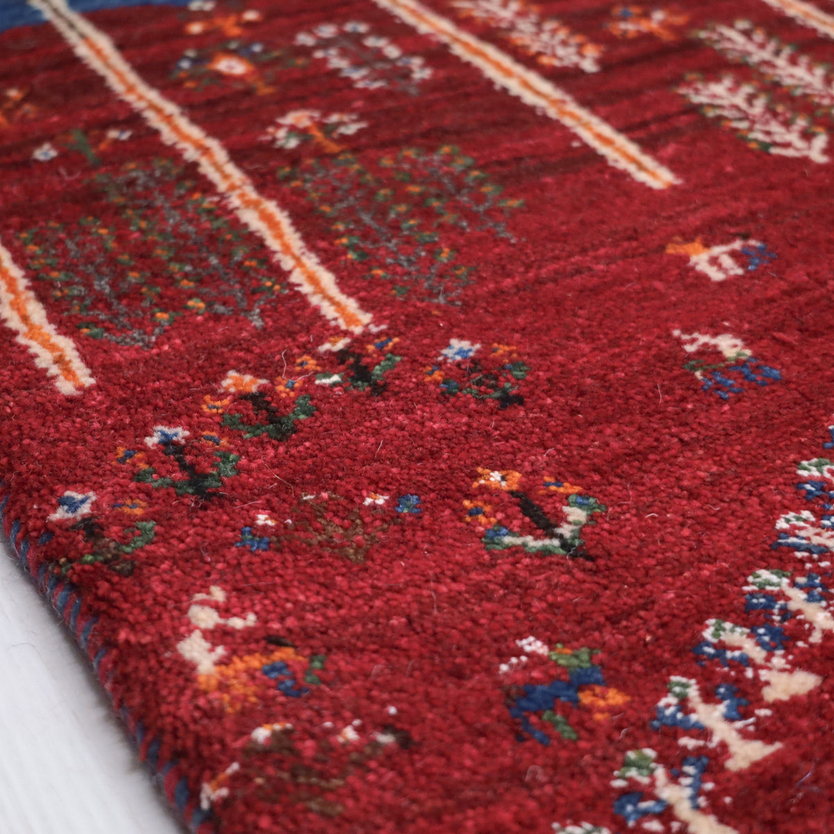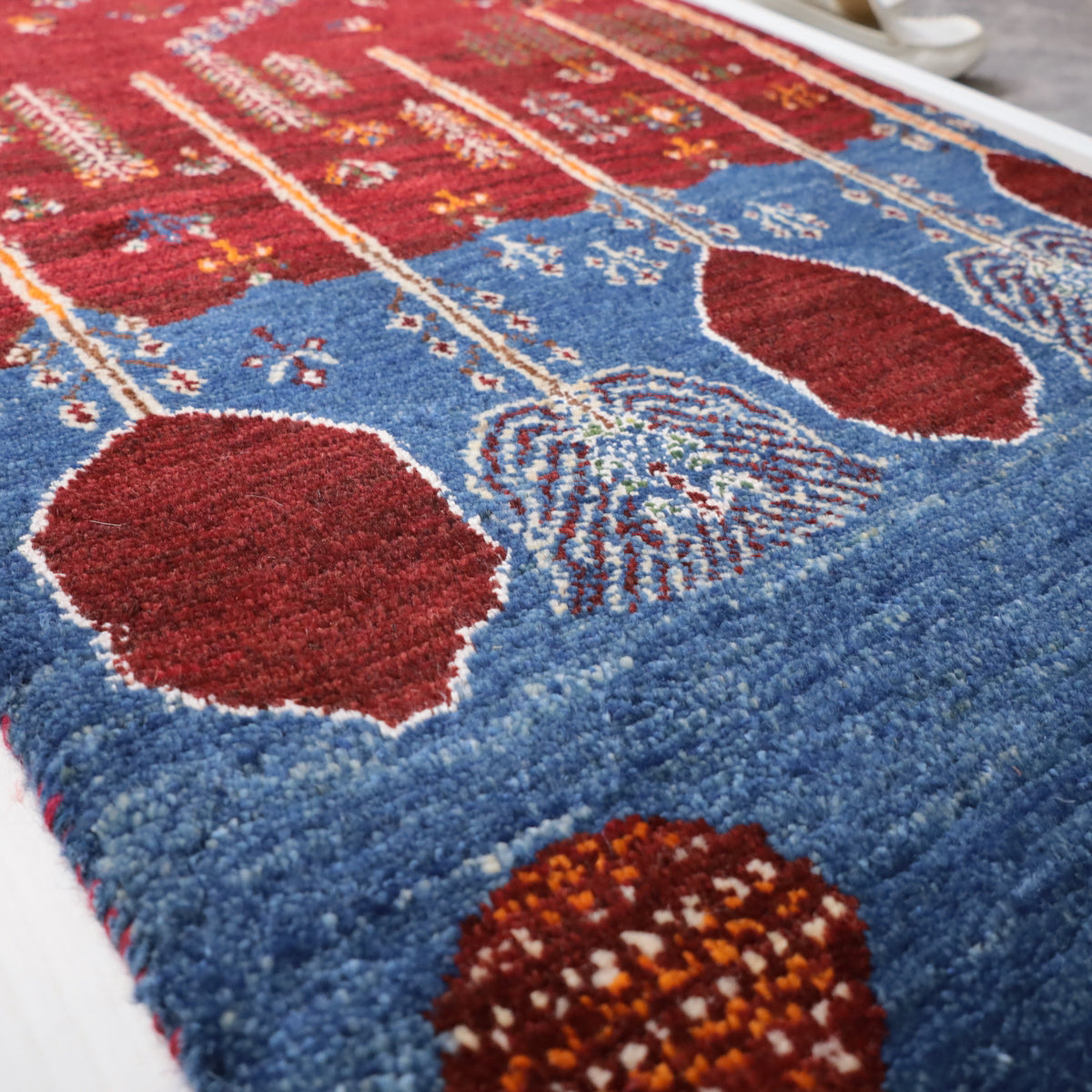 ルリ族によって織られる「ルリバフ」というギャッベは、通常のギャッベの織り目よりもはるかに細かく織られています。ルリバフは高い技術を持つ選ばれた織り子だけが手掛けることができ、デザインは細やかで柔らかなウール素材、やんわりと沈み込む快適な踏み心地のハイランクな上質ギャッベです。