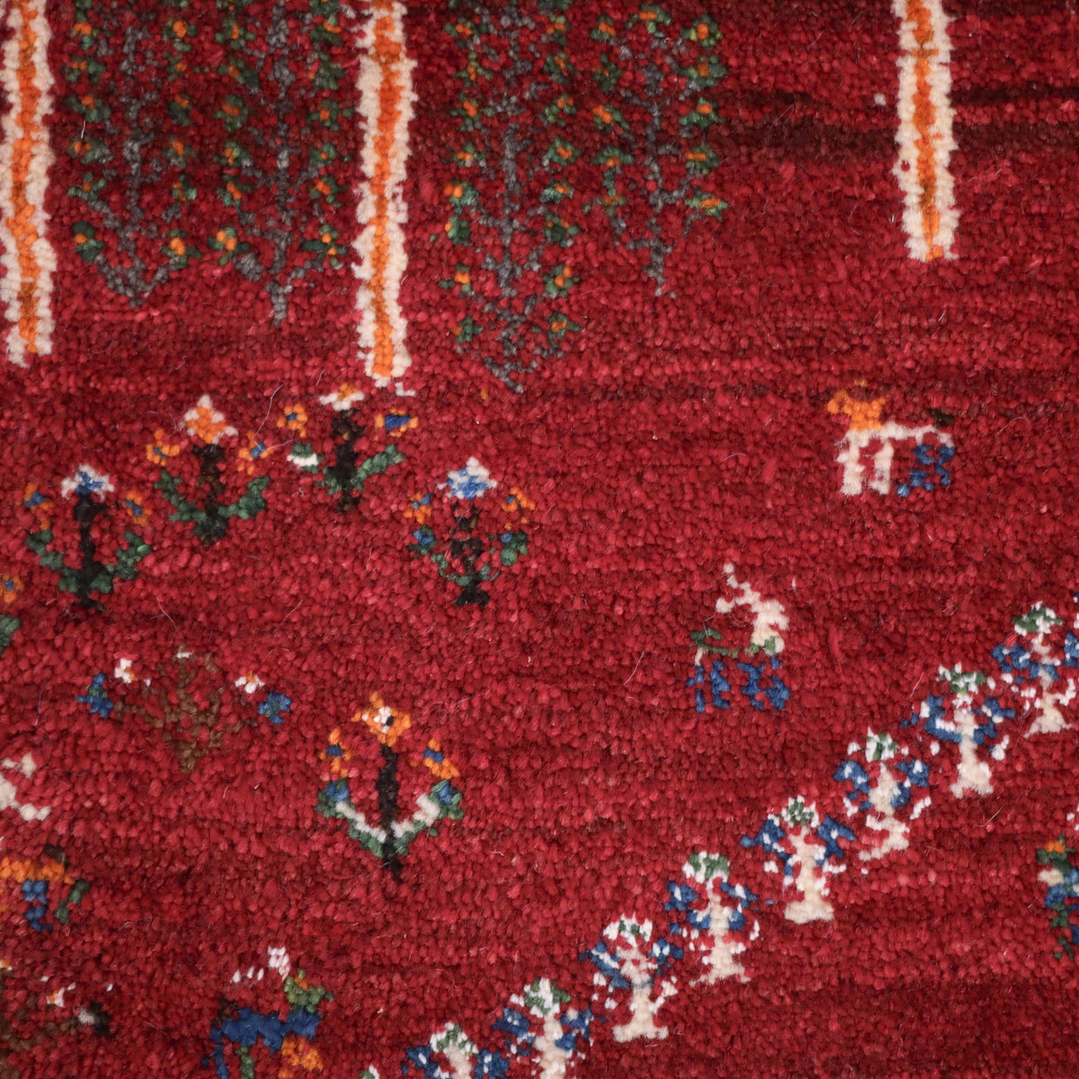 まっすぐ長く伸びた大きな花の様子がたいへんユニークなデザインです。花と動物のたくさん入った彩の豊かな可愛いギャッベ。
