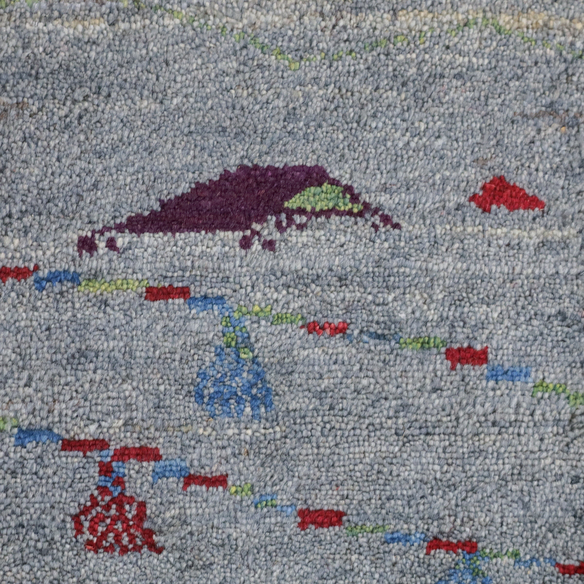 濃淡の細かなアブラシ(グラデーション)が綺麗な明るい緑のギャッベ。山並みと太陽と2つのテント、そして、いくつかの斜めのラインは、結婚式の時に飾り付けられるカラフルなライトをモチーフにしています。楽しい思い出を表したギャッベなのだと思います。