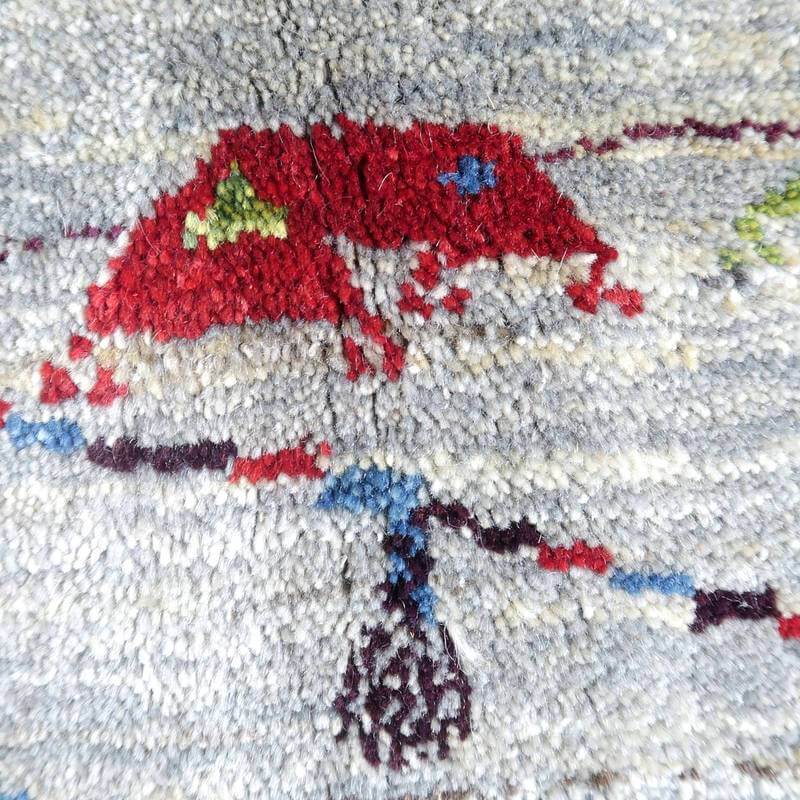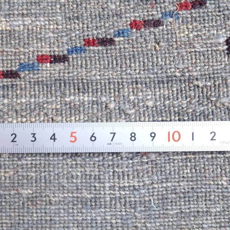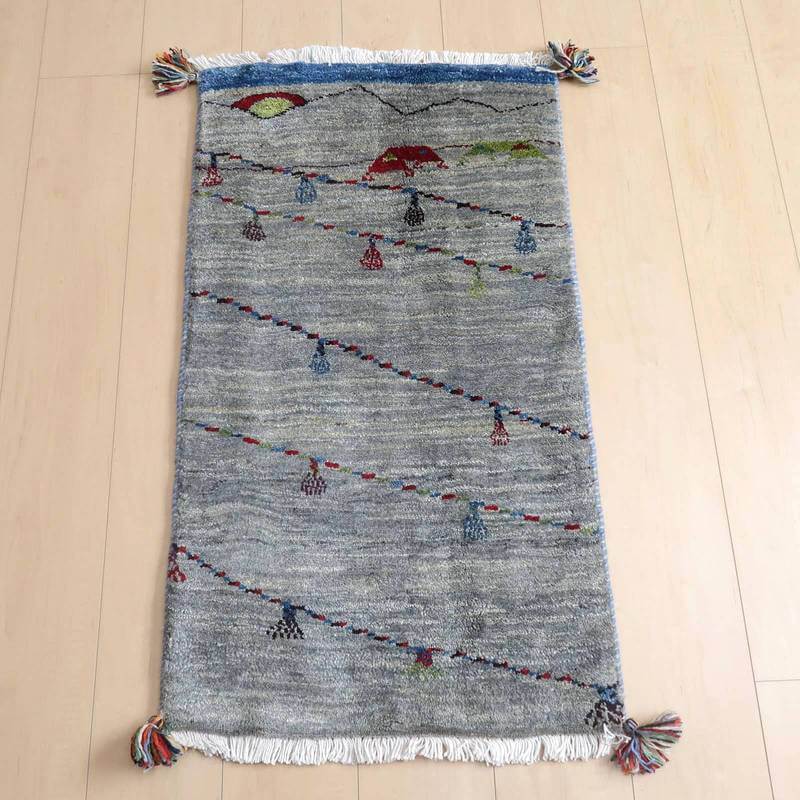 山並みと太陽と遊牧民のテント、そして、いくつかの斜めのラインは、結婚式の時に飾り付けられるカラフルなライトをモチーフにしています。楽しい思い出を表したギャッベなのだと思います。グレーを基調とした落ち着いたトーンのギャッベです。形に手織りならではカーブが感じられます。