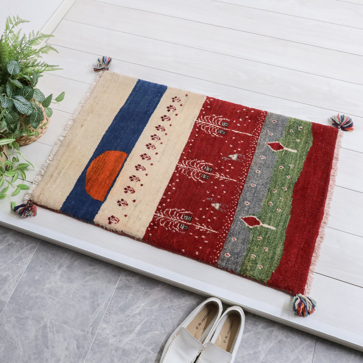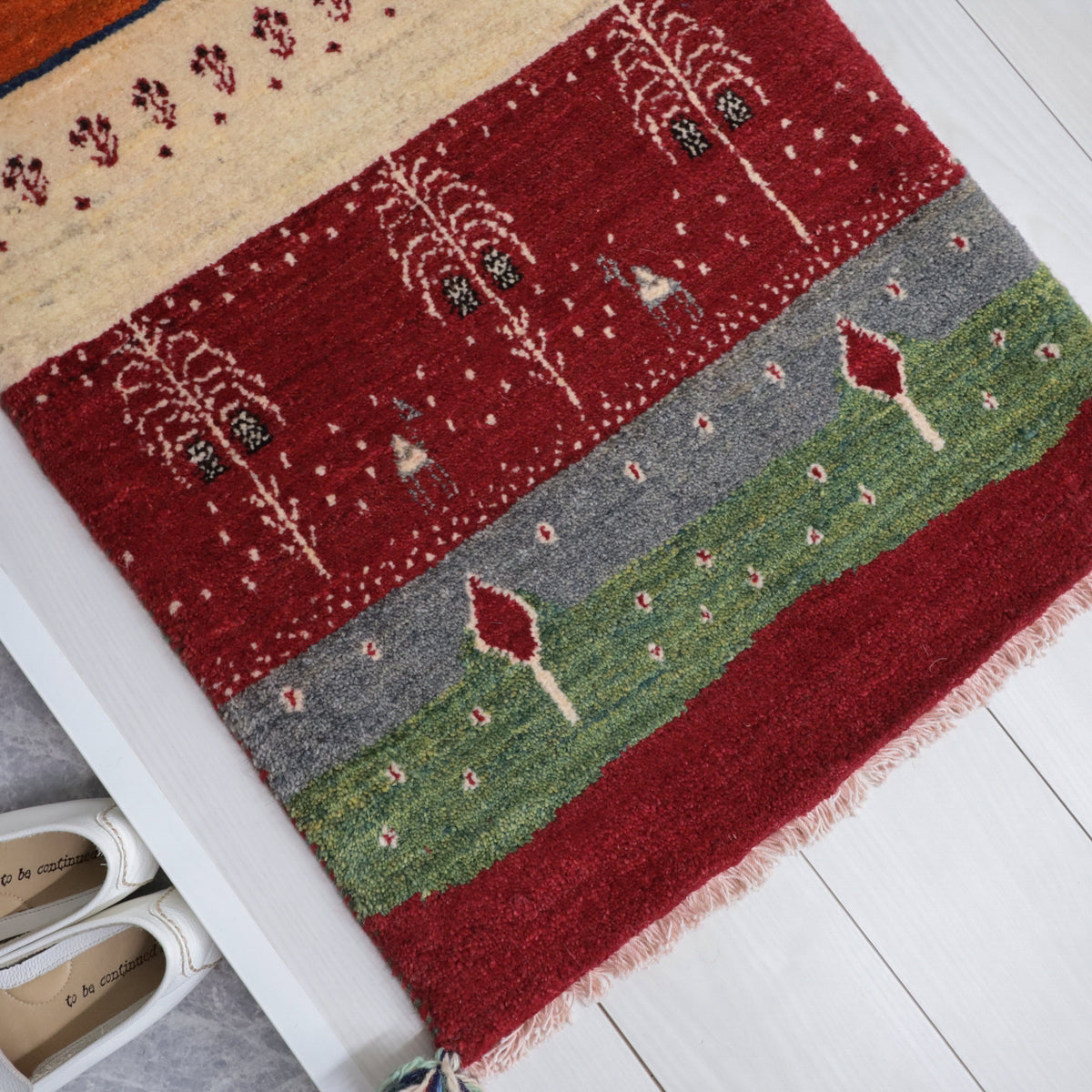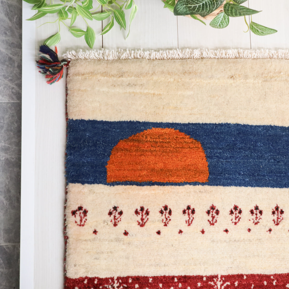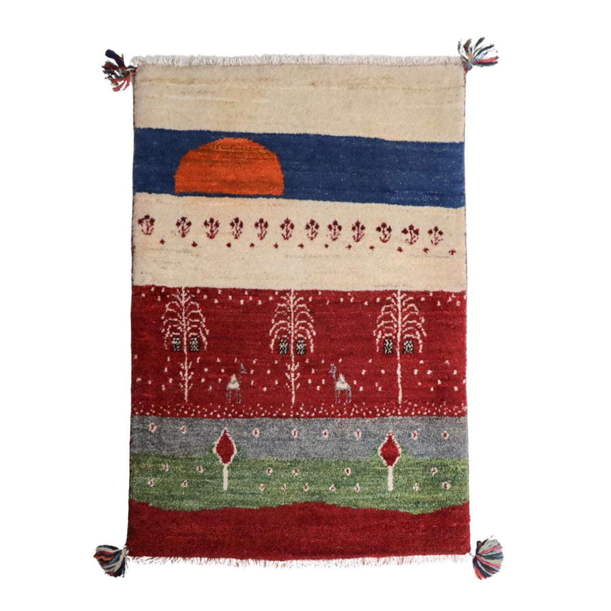 羊の毛色をそのまま活かした生成り、落ち着きのある赤色を基調としたオアシス風景のランドスケープ・デザイン。カラフルな明るい色調はお部屋のアクセントにおすすめ。絵のように飾っても素敵です。