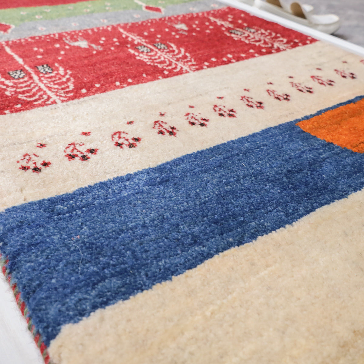 ルリ族によって織られる「ルリバフ」というギャッベは、通常のギャッベの織り目よりもはるかに細かく織られています。ルリバフは高い技術を持つ選ばれた織り子だけが手掛けることができ、デザインは細やかで柔らかなウール素材、やんわりと沈み込む快適な踏み心地のハイランクな上質ギャッベです。