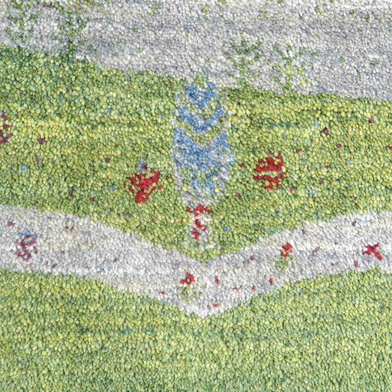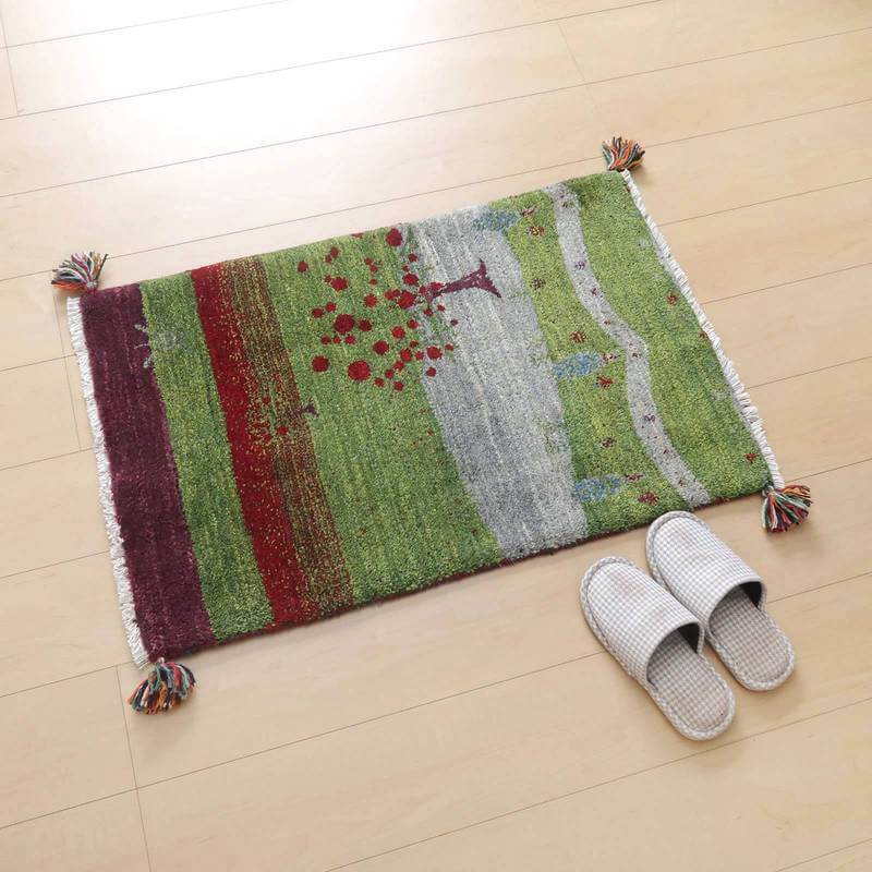緑の草原と太陽の照り返し、広がりのある風景をギャッベに写しとった絵本の挿絵のような幻想的な雰囲気のある美しいランドスケープデザインです。落ち着きのあるモスグリーンがベースの自然を感じさせるカラー。