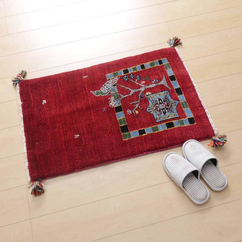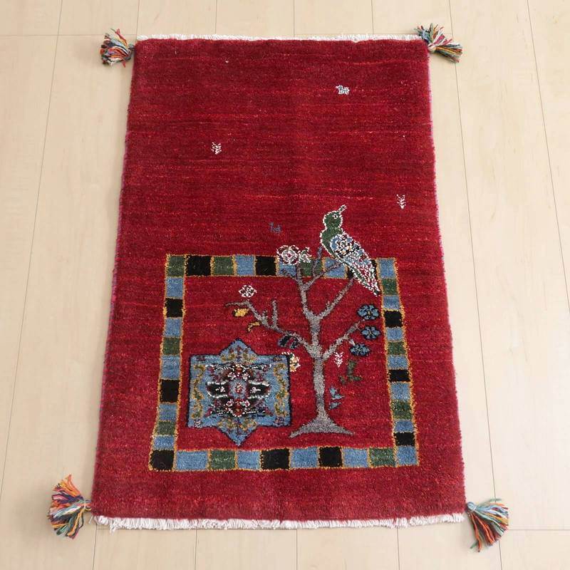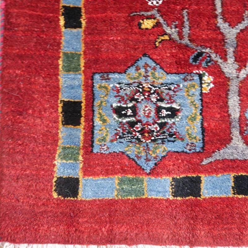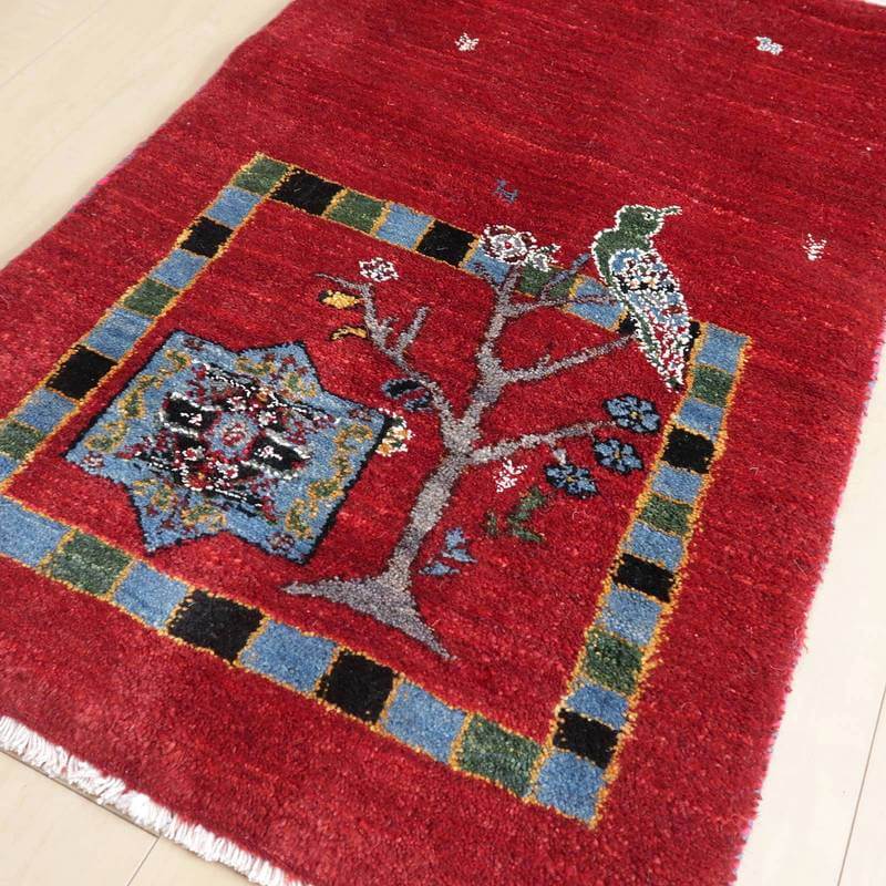 濃淡の細かなアブラシ(グラデーション)が綺麗な明るい赤、生命の木にとまる鳥が詩的な雰囲気で描かれています。詩の国イランらしい詩集の挿絵のようなモダンなギャッベです。絵としても飾れるデザイン。