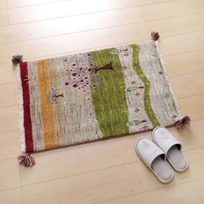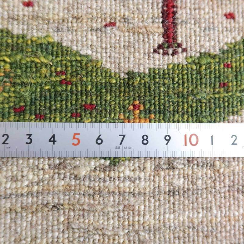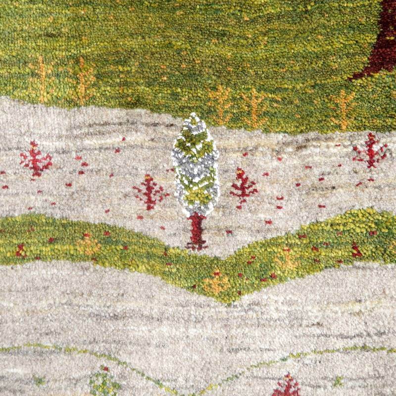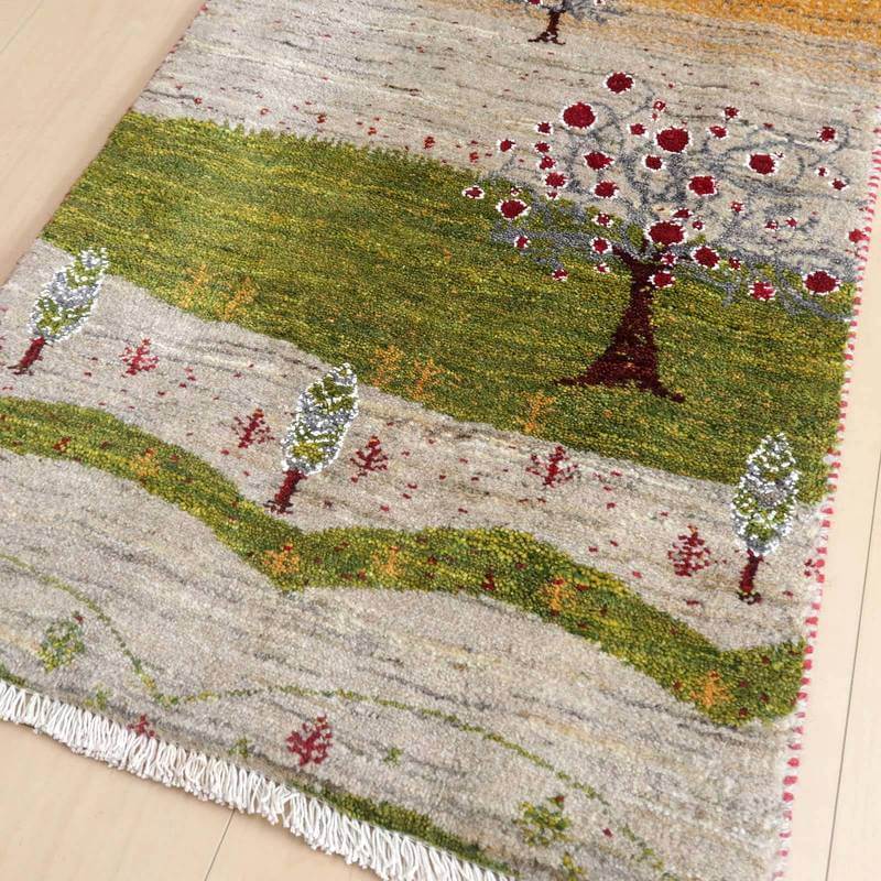 緑の草原と太陽の照り返し、広がりのある風景をギャッベに写しとった絵本の挿絵のような幻想的な雰囲気のある美しいランドスケープデザインです。羊の毛色を活かしたグレーベージュのナチュラルカラー。デザインを引き立てる為のコットンシルクが一部(特に白く見える部分)に使われています。