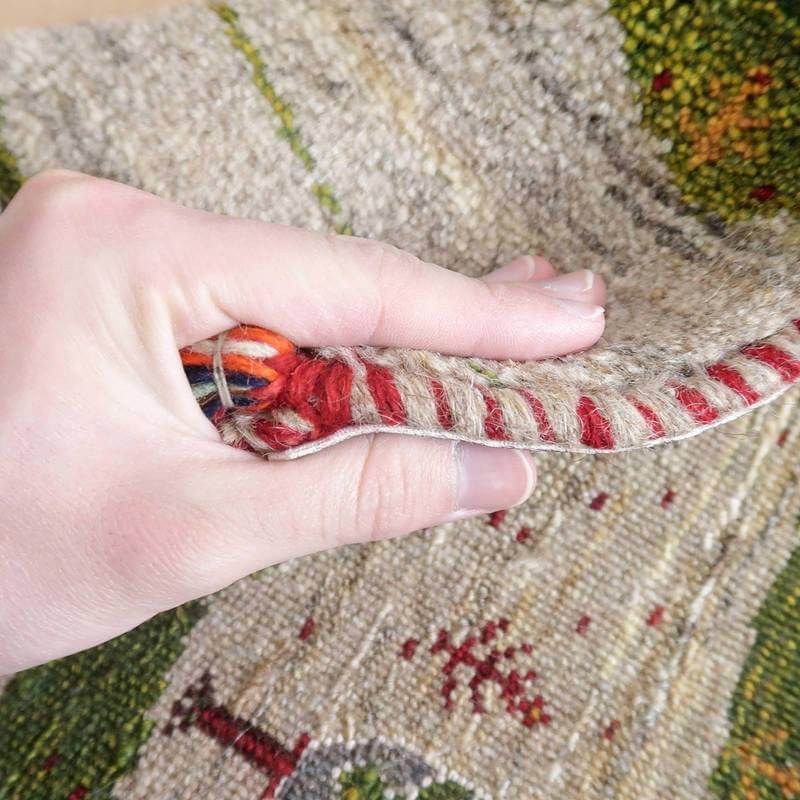 織りは、10cmあたり、およそ40から45目という普通のギャッベの数倍にもなる大変細かなルリバフ。抜け毛が少なく、手触りはふわりと柔らか。踏んだ時やんわりと沈み込む踏み心地です。腕の良い選りすぐられた織り子だけが手掛ける極上の手仕事です。