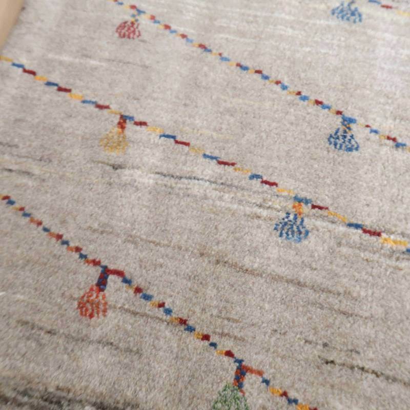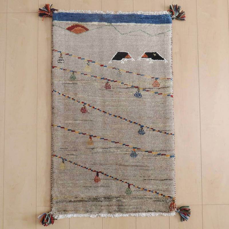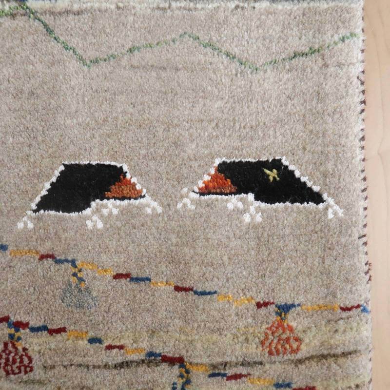 山並みと太陽と遊牧民のテント、そして、いくつかの斜めのラインは、結婚式の時に飾り付けられるカラフルなライトをモチーフにしています。楽しい思い出を表したギャッベなのだと思います。グレーベージュを基調とした落ち着いたトーンのギャッベです。右端の長さが91センチ、左端の長さが93センチです。
