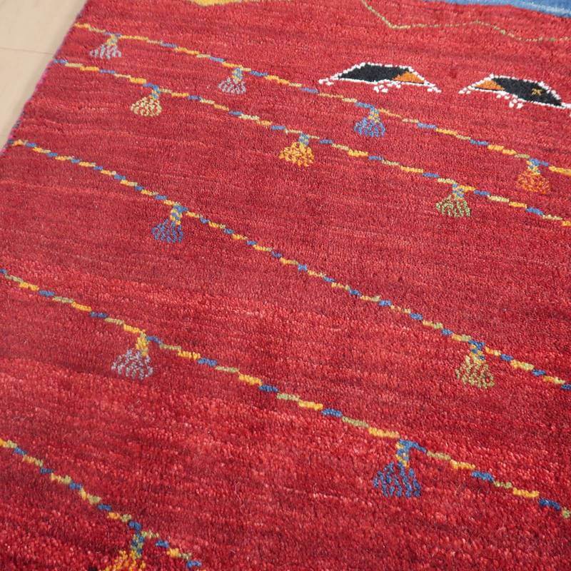 濃淡の細かなアブラシ(グラデーション)が綺麗な明るい赤のギャッベ。山並みと太陽と2つのテント、そして、いくつかの斜めのラインは、結婚式の時に飾り付けられるカラフルなライトをモチーフにしています。楽しい思い出を表したギャッベなのだと思います。