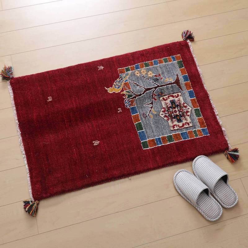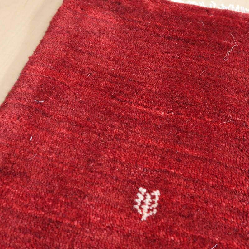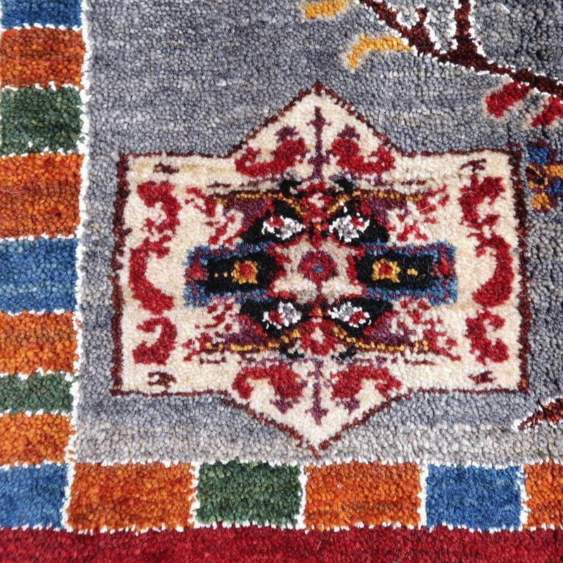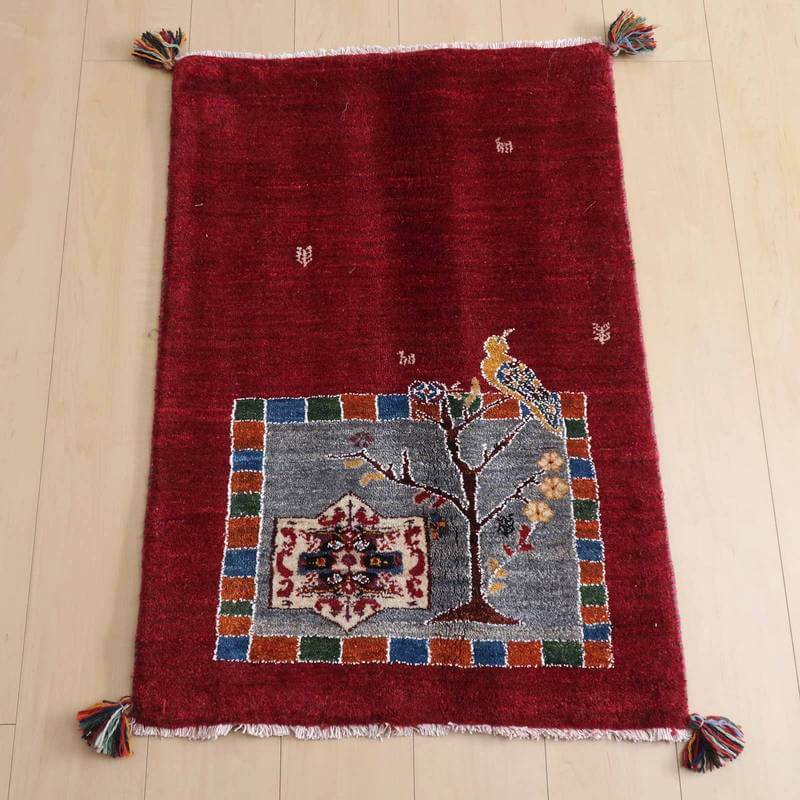濃淡の細かなアブラシ(グラデーション)が綺麗な落ち着いた赤、生命の木にとまる鳥が詩的な雰囲気で描かれています。詩の国イランらしい詩集の挿絵のようなモダンなギャッベです。絵としても飾れるデザイン。