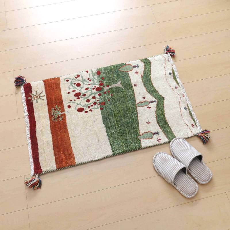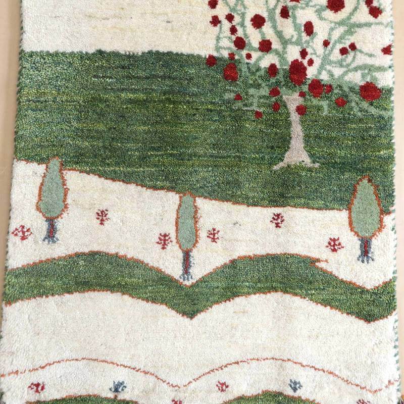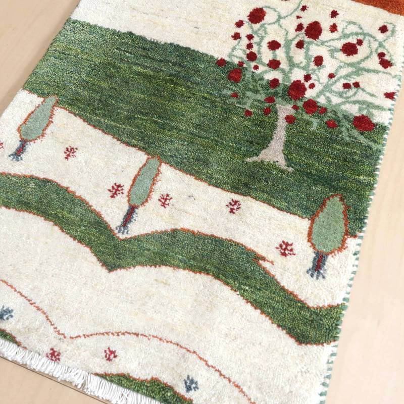 緑の草原と太陽の照り返し、広がりのある風景をギャッベに写しとった絵本の挿絵のような幻想的な雰囲気のある美しいランドスケープデザインです。羊の毛色を活かしたナチュラルカラーをベースに、くっきりとした色づかい。